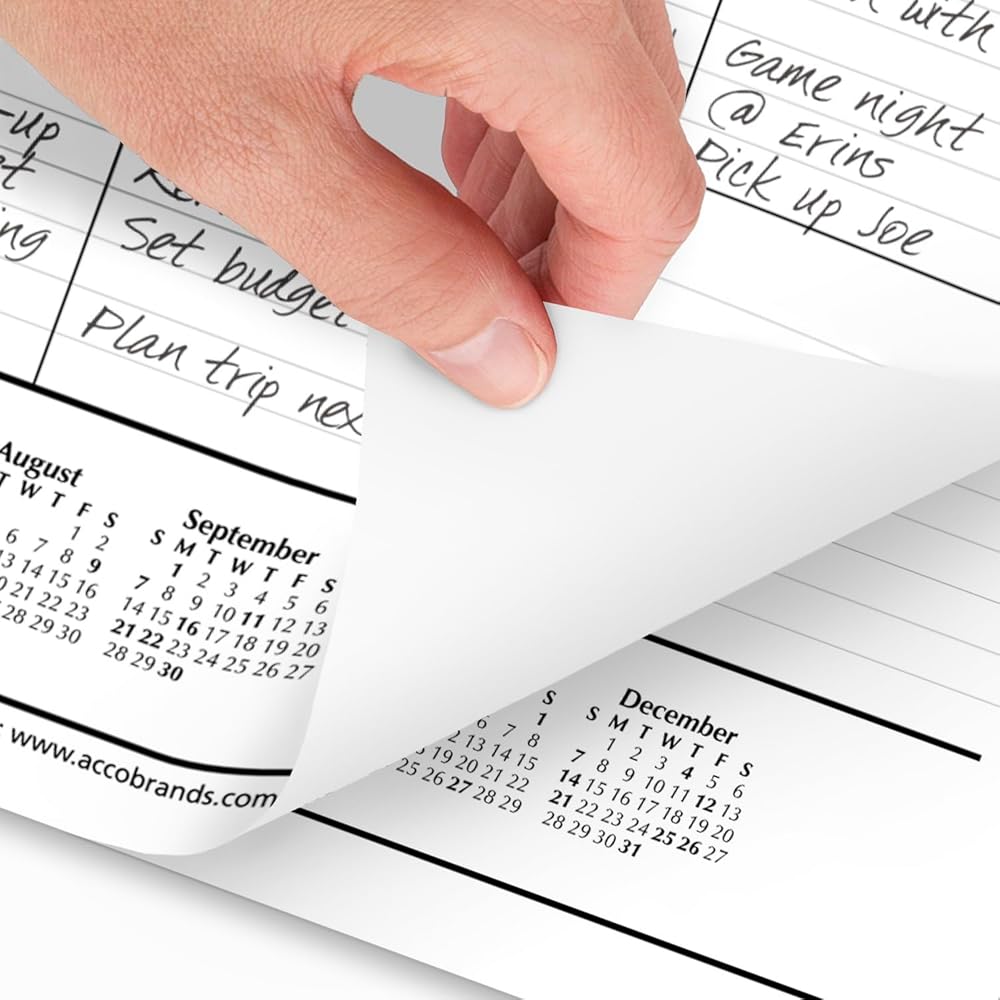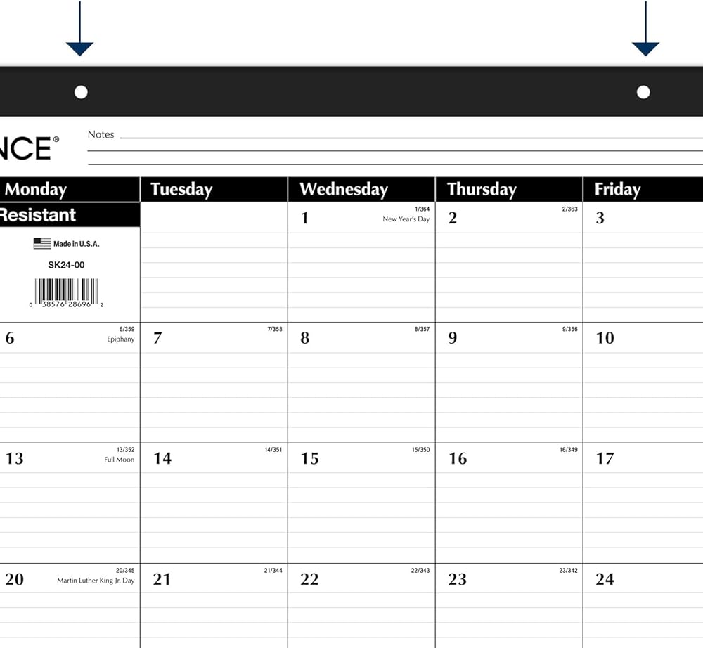 With the AT-A-GLANCE Monthly Desk Pad Calendar, you can keep your schedule in view while protecting your desktop. Date range covers 12 months from January 2025 — December 2025. Plan your schedule without fear of distracting ink bleeding. High-quality paper features ink bleed resistance. One month per page format has ruled daily with plenty of space to jot down plans and 2 reference calendar blocks. 21-3/4" x 17" page size. Daily blocks measure 2-7/16" x 2-1/4" . The past and future month calendar blocks shown on each monthly page are a convenient way to check dates as you plan. Special features include perforated pages and two black, poly corner protectors to help keep pages flat. Calendar has a black headband and two holes for optional wall hanging. Durable backboard provides a sturdy writing surface.