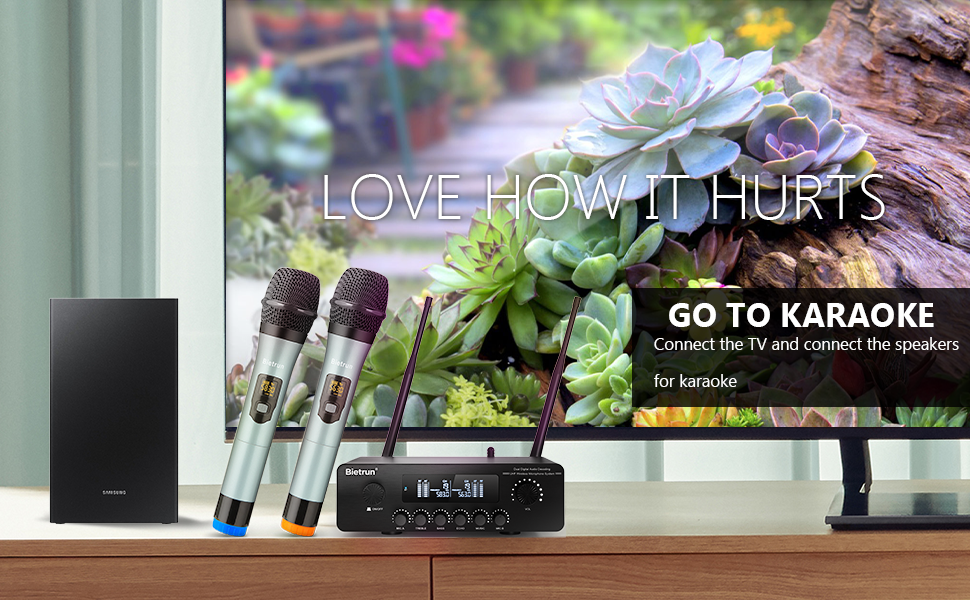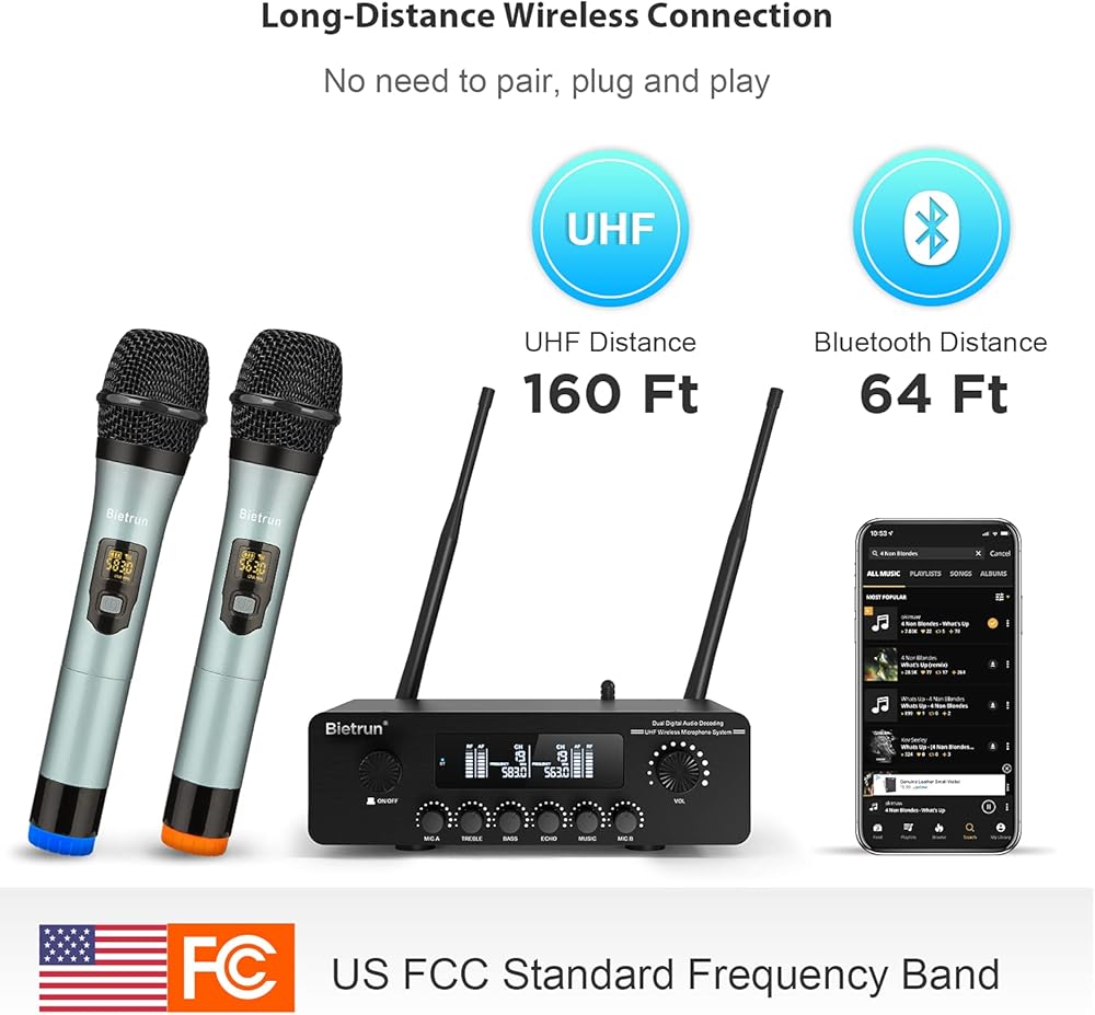 الإشارة اللاسلكية: ●جهاز استقبال مزود بهوائيات محسّنة قابلة للفصل، يصل نطاق الإشارة إلى 160 قدمًا/50 مترًا. ●يعمل هوائي البلوتوث الخارجي المحسن على توسيع تغطية صوت البلوتوث إلى 64 قدمًا/20 مترًا، ويمكنك استخدام هاتفك للاتصال بالبلوتوث (Bietrun 15) لتشغيل الموسيقى المفضلة لديك للكاريوكي.