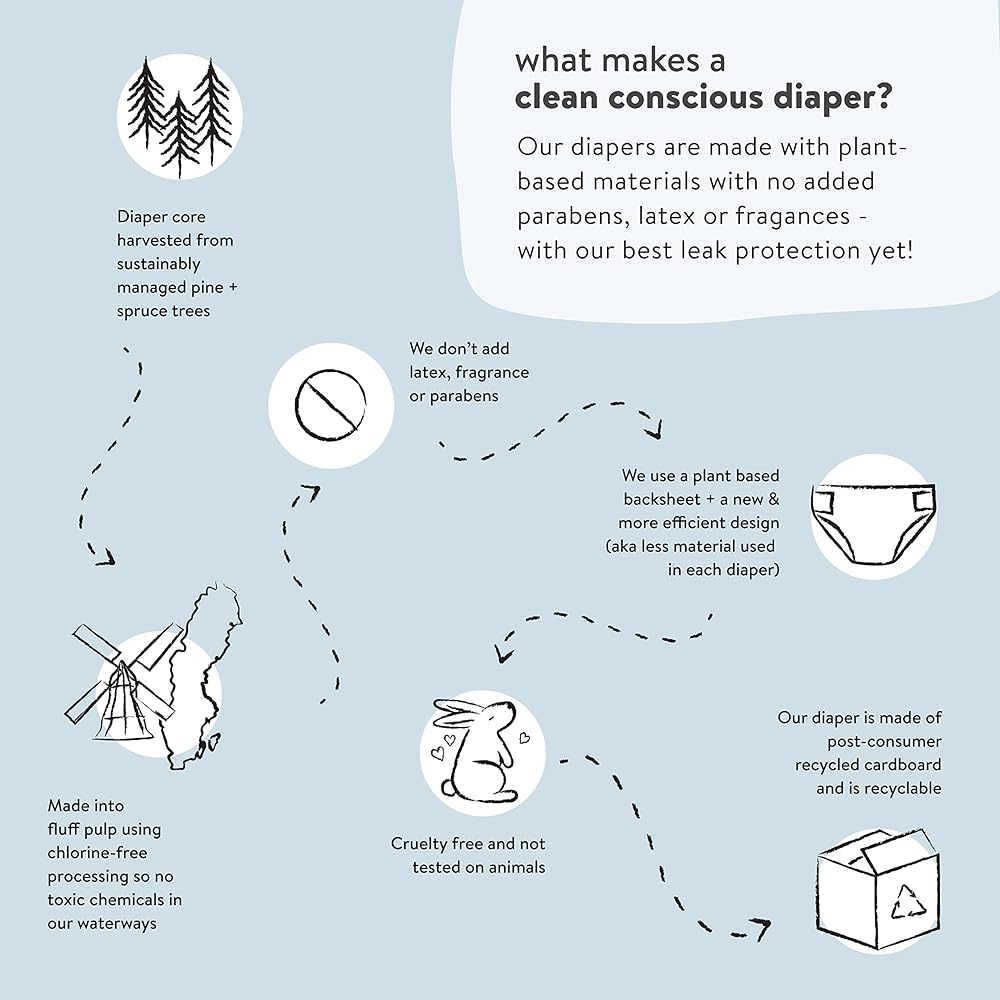 Our most earth conscious diapers yet feature a wetness indicator, better absorption & blowout protection, cloud-like comfort and unique features for each babe stage – all while using less material and helping save over 7000 trees every single year. Plus, a secure, comfy fit for less sag + more swag. What Makes A Clean Conscious Diaper? To make the core of the diaper, we harvest wood from sustainably managed pine + spruce trees in Scandinavia, which is then turned into fluff pulp at a Swedish mill using totally chlorine-free processing. We don't add latex, fragrance, or parabens. We use a 100% plant-based backsheet, and our new, more efficient design reduces the amount of material used in each diaper. Our diapers are cruelty-free and never tested on animals. Our diaper boxes are made from 100% PCR post recycled consumer cardboard (aka they're 100% recyclable) – that means no new trees cut down and no landfill, if recycled.