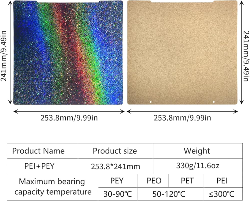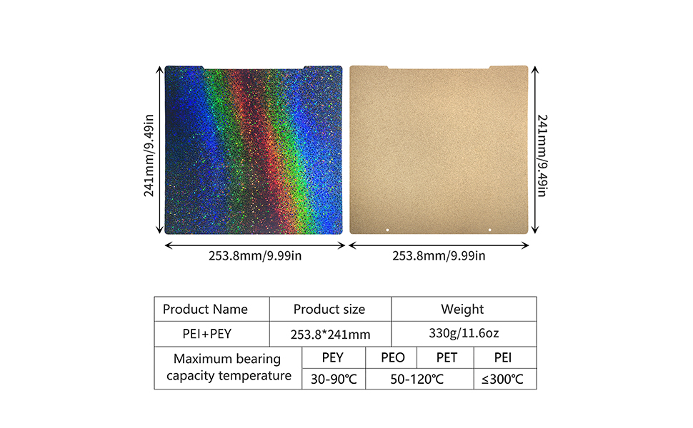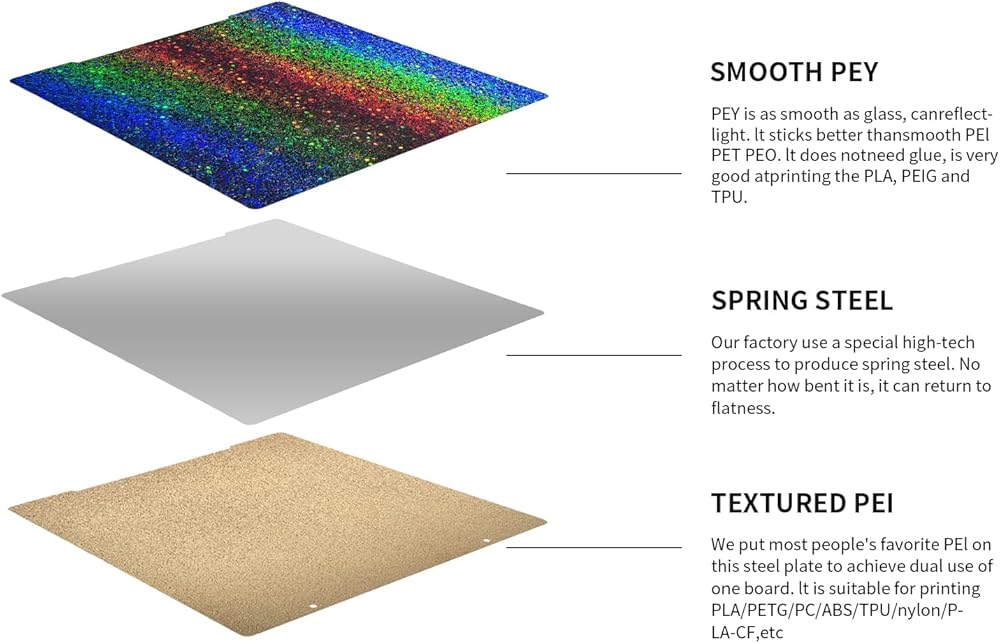 4. دعم طباعة الخيوط المختلفة: بعد اختبارنا الشامل، نوصي بطبقة PEY لطباعة PLA/ TPU/ PETG. (درجة الحرارة المقترحة: 50 درجة مئوية - 70 درجة مئوية، ≥90 درجة مئوية). طباعة طبقة PEI PLA / PLA-CF / PETG / PC / ABS / TPU / نايلون إلخ.