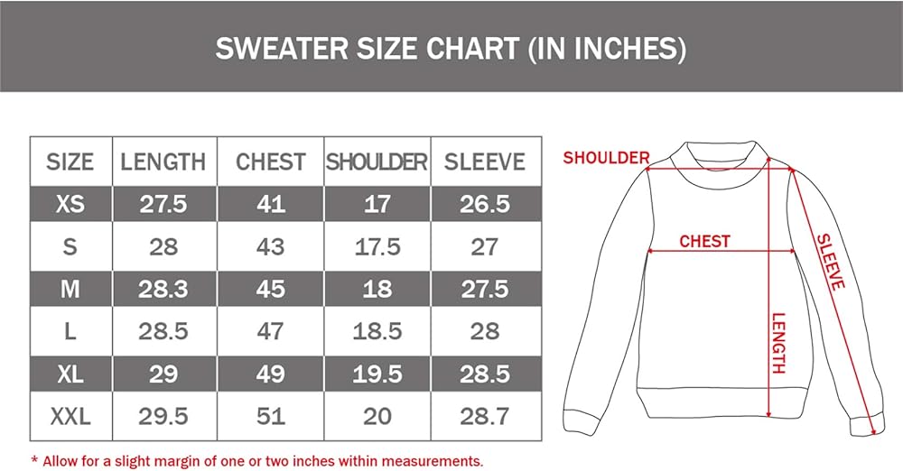 الحجم المناسب. لضمان أفضل ملاءمة ممكنة لسترة عيد الميلاد المضحكة القبيحة الخاصة بك، نقدم عددًا من خيارات المقاسات من XS إلى XXL. لتجنب خيبة الأمل، ننصحك بشدة بمراجعة جدول المقاسات للعثور على المقاس المناسب وقياس نفسك حرفيًا باستخدام شريط القياس