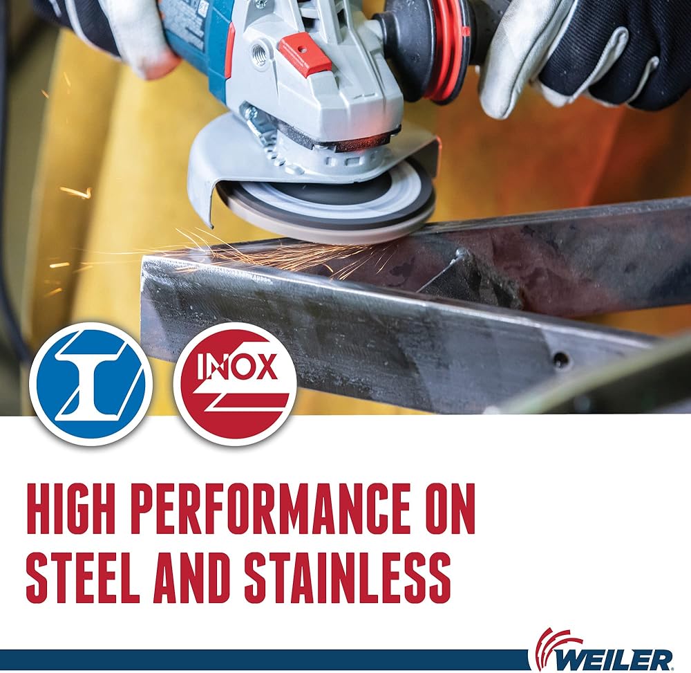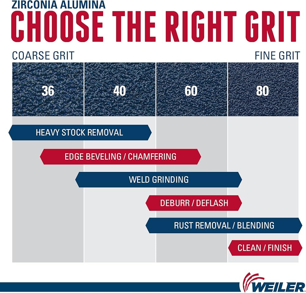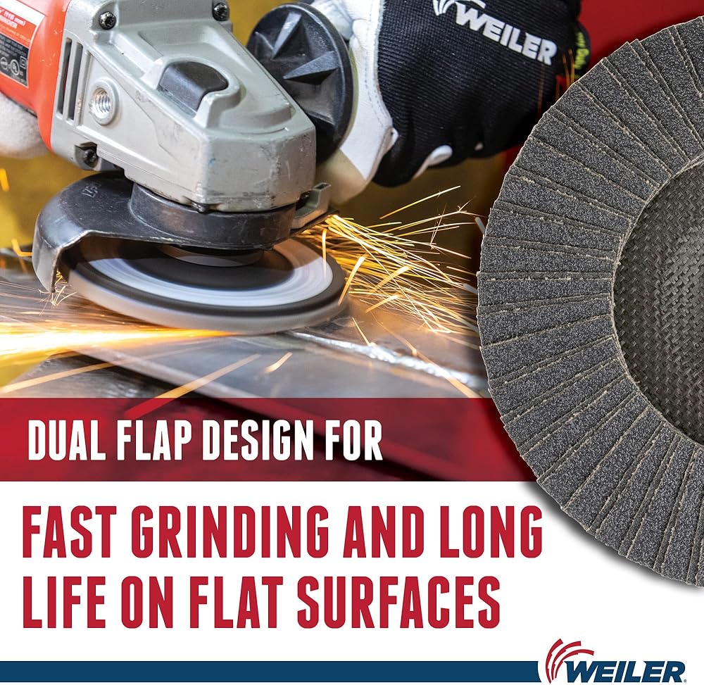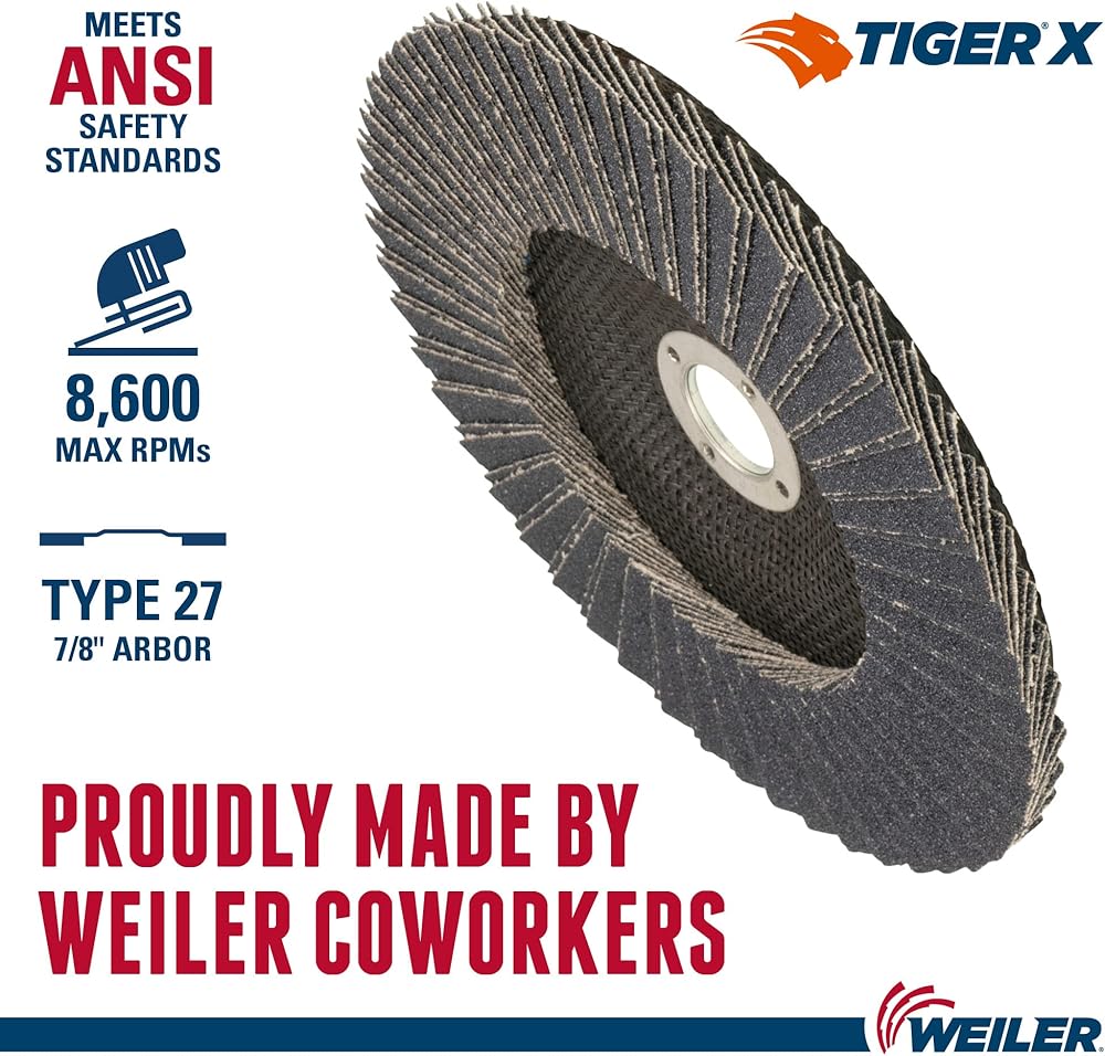 Weiler Tiger Paw flap discs are designed for the user looking for aggressive performance and long life in heavy-duty applications like edge grinding. 100 percent zirconium grain is fast cutting with long life, resulting in fewer change overs and increased productivity. Superior grain retention - lasts longer and maintains perfect cutting angle to provide excellent performance and sustained stock removal when grinding on-edge. Engineered poly/cotton cloth features excellent grain retention for maximum disc life. Phenolic prevents backing from scratching the workpiece. Zirconium grain features multi- crystal, fast cut rate, self- sharpening, stands up to heavy pressure and high temperatures and high rate of stock removal and long life in demanding applications. Smooth action and long life; for heavy - duty applications on steel and stainless.