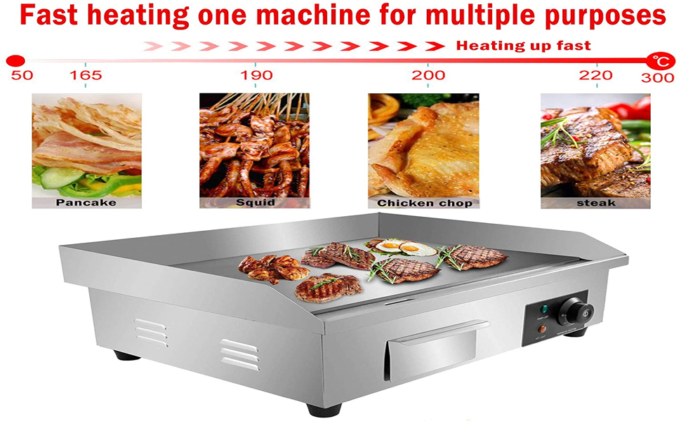 • 【ثرموستاتي قابل للتعديل】يسمح لك التحكم الحراري بضبط درجة حرارة الشواية لتناسب متطلبات الطبخ للأطعمة المختلفة. تتراوح درجة الحرارة من 122 درجة فهرنهايت - 572 درجة فهرنهايت (50 درجة مئوية - 300 درجة مئوية)