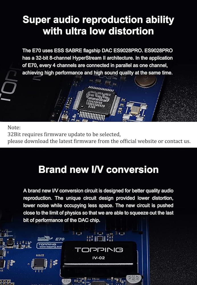 • 👍 شريحة DAC ذات 8 قنوات ▶️ يستخدم جهاز E70 DAC ES9028PRO الرائد من ESS SABER. يحتوي ES9028PRO على بنية HyperStream ll ذات 8 قنوات 32 بت. في تطبيق E70، يتم توصيل كل 4 قنوات بالتوازي كقناة واحدة، مما يحقق قدرة فائقة على إعادة إنتاج الصوت وتشويه منخفض للغاية. ملاحظة: ملاحظة: يتطلب الإصدار 32 بت تحديد تحديث البرنامج الثابت، يرجى تنزيل أحدث برنامج ثابت من الموقع الرسمي أو الاتصال بنا.