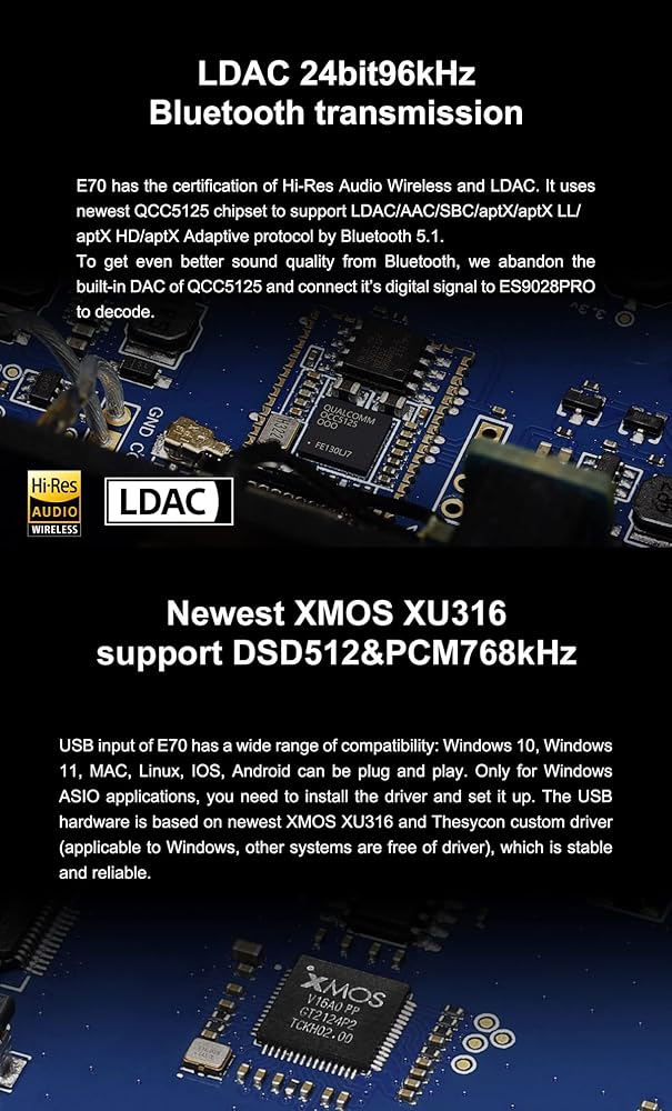 • 👍 نقل بلوتوث LDAC 24 بت 96 كيلو هرتز ◀️ E70 حاصل على شهادة Hi-Res Audio Wireless وLDAC. يستخدم أحدث شرائح QCC5125 لدعم بروتوكول LDAC/AAC/SBC/aptX/aptX LL/aptX HD/aptX Adaptive عبر Bluetooth 5.1. للحصول على جودة صوت أفضل من تقنية Bluetooth، قمنا بالتخلي عن DAC المدمج في QCC5125 وقمنا بتوصيل الإشارة الرقمية الخاصة به إلى ES9028PRO لفك التشفير.