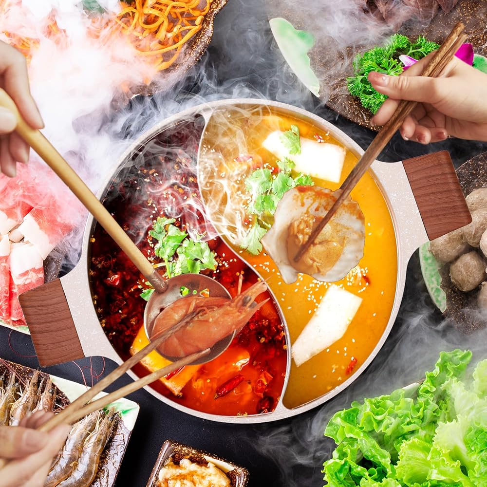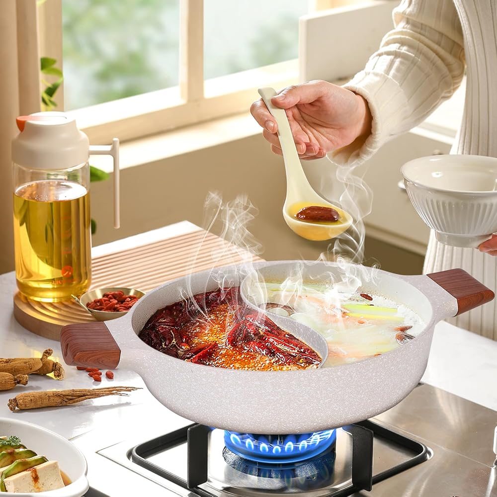 • 【ذوق مزدوج】: يقسم وعاء الوعاء الساخن المزود بفاصل وعاء واحد إلى قسمين حتى تتمكن من تذوق نكهتين من الوعاء الساخن في نفس الوقت، كما أن وعاء شابو شابو الساخن مع حجرة غير ملحومة على شكل حرف S يتميز بمقاومة جيدة للانسكاب والتسرب. الوظيفة، لا يمكن استخدام موقد وعاء شابو شابو لطهي الوعاء الساخن فحسب، بل يمكنك أيضًا استخدامه لطهي نوعين من الطعام في وقت واحد، حتى تتمكن من قضاء وقت أقل لتناول المزيد من الطعام.