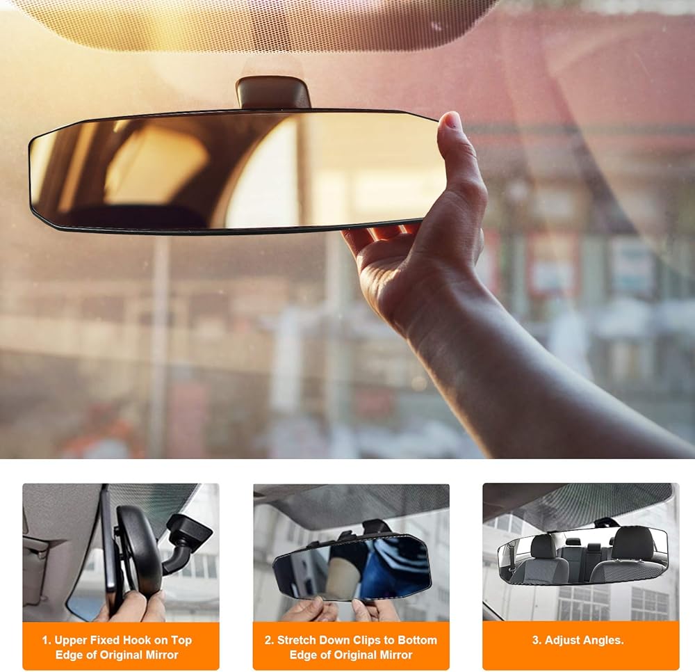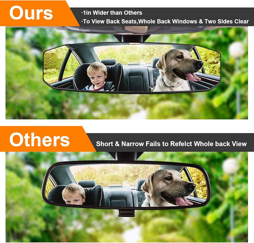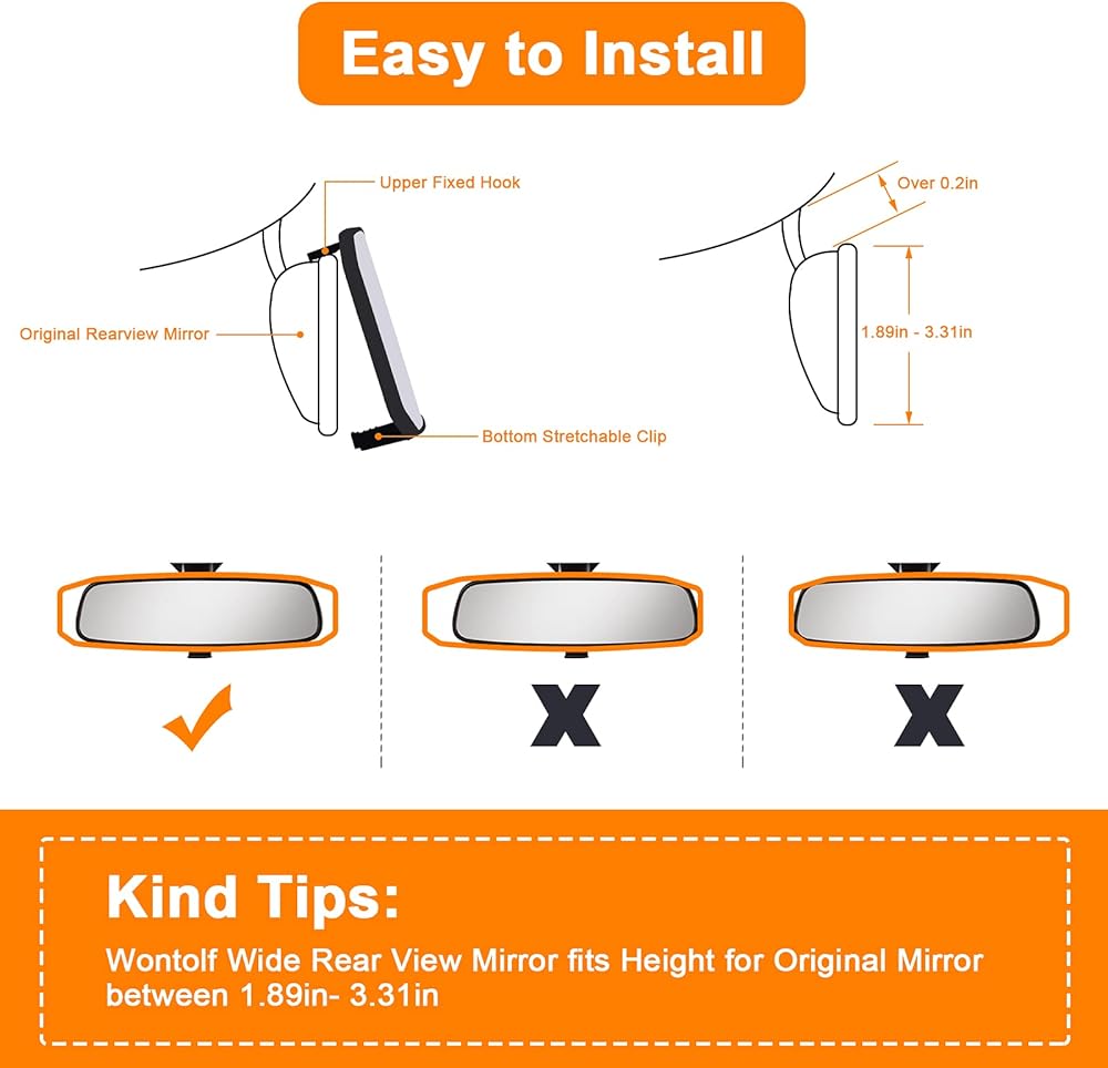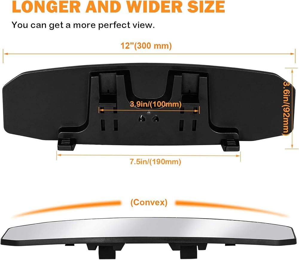 【Lengthened & Wider; Wider View】- 12X 3.6 inches, largest rear view mirror on the market. Longer and wider than most rear view mirrors, Wontolf wide angle rear view mirror ensures a clear view of back seats, the whole back windows and two sides back surrounded car. Bring a broader view and great visibility while eliminates blind spots for a safer driving.
