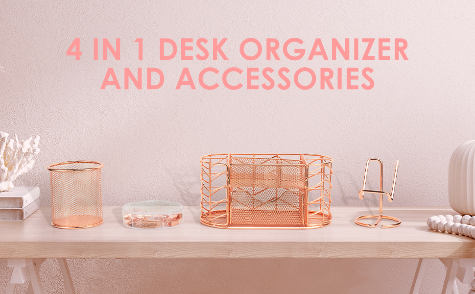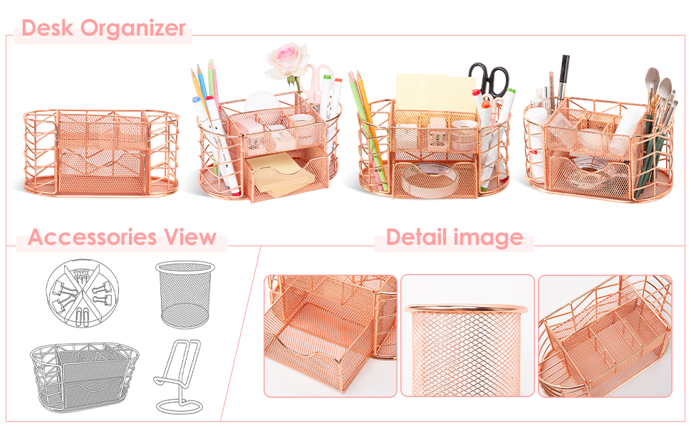 ✿ تنظيم بدون مجهود، أناقة لا تتأثر بمرور الزمن✿: يتميز منظم المكتب الخاص بنا بـ 8 مساحات واسعة ودرج منزلق، مما يوفر مساحة واسعة لجميع ضرورياتك. يضيف المظهر الذهبي الوردي الساحر، الذي تم إنشاؤه باستخدام تقنية الطلاء الكهربائي المتطورة، لمسة من الرقي إلى مساحة العمل الخاصة بك، مما يرفع من الأسلوب والإنتاجية. استعد للاستلهام من المزيج السلس بين التنظيم والأسلوب.