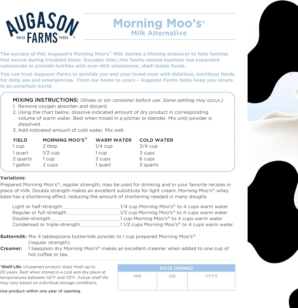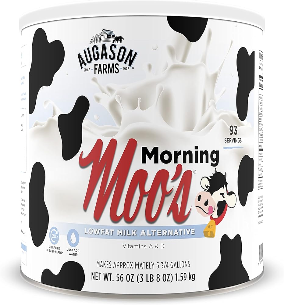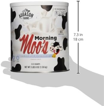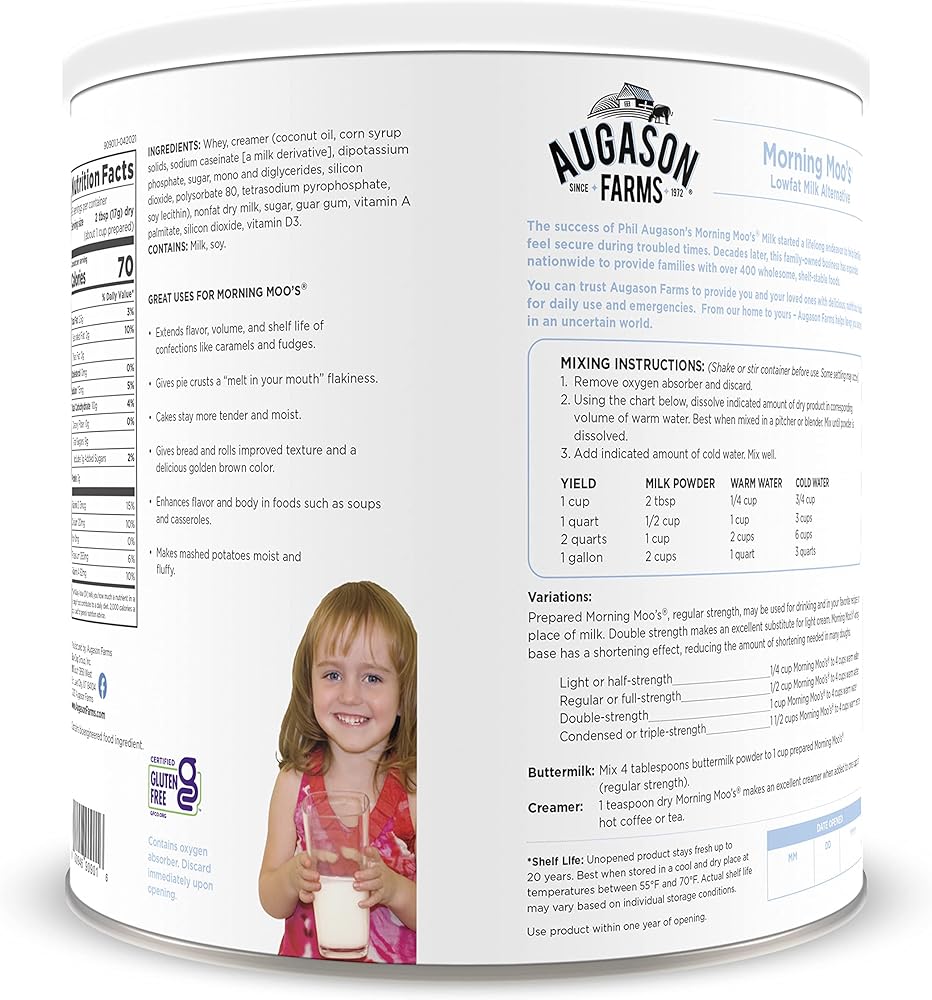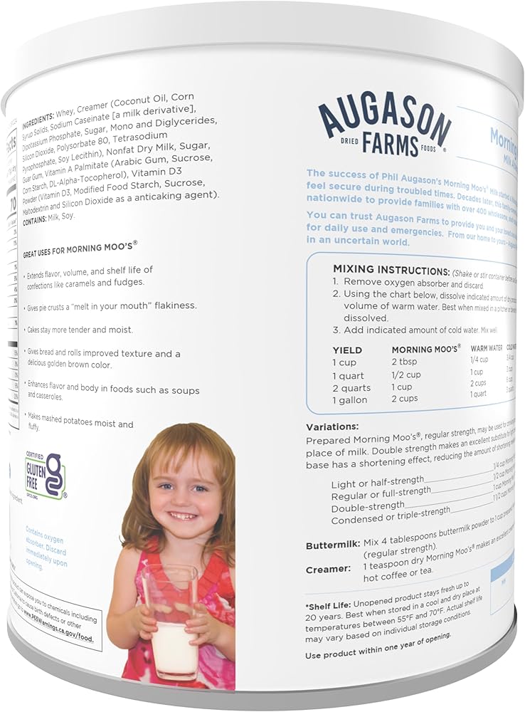 Augason Farms morning moos is a whey-based powdered milk beverage that's ideal for everyday use or as a part of your emergency food supply. It looks and tastes like fresh milk, is rich in calcium and fortified with vitamins a and d, much like 2% milk. Add the indicated amount of water to easily enjoy this powdered milk beverage, whether you prefer to drink it straight from the glass, poured over cereal, or enjoy steaming hot with added flavor. This dry powdered milk alternative can also be used as a substitute for light cream by adding only half the recommended amount of water. Enjoy all the goodness of milk without the need for refrigeration, whether today or in times of emergency. Shelf life up to 20 years based on storage conditions. Certified gluten free. Family owned and operated since 1972, Augason Farms products are guaranteed for their great taste and superior quality. Include Augason Farms in your pantry for everyday use or in your emergency food supply for the unexpected.