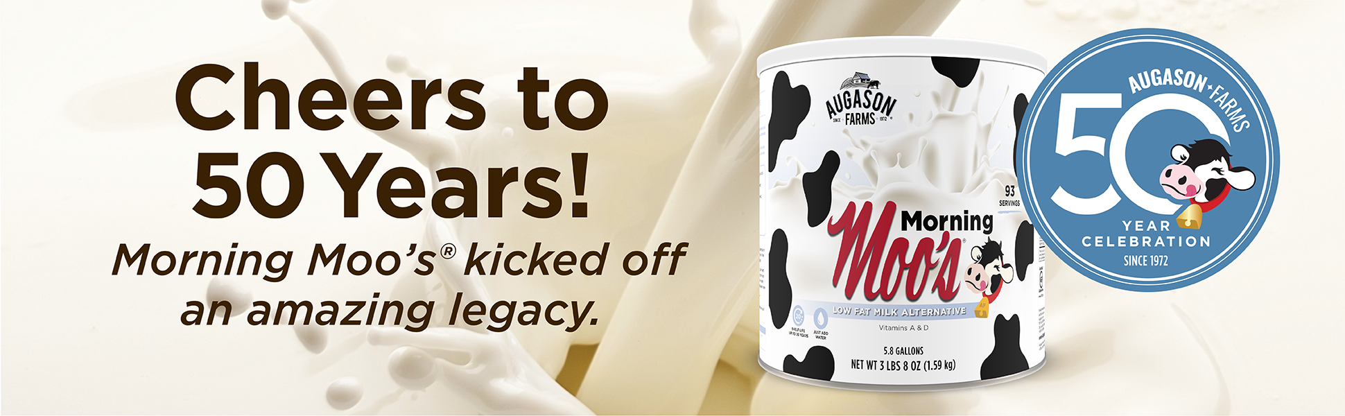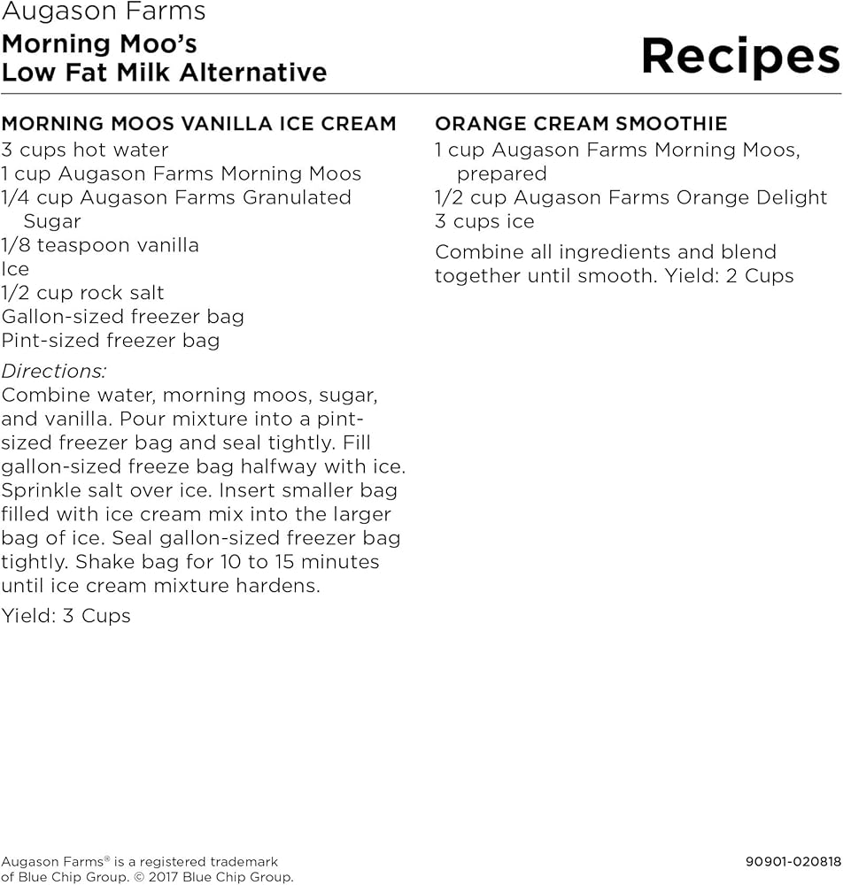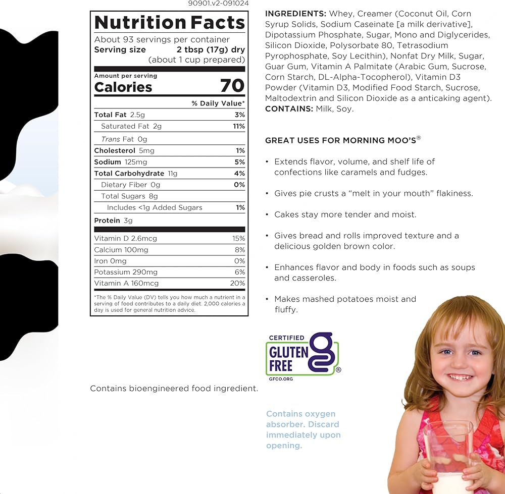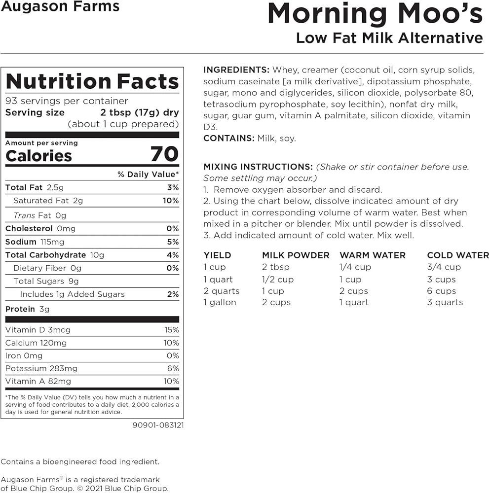 Augason Farms morning moos is a whey-based powdered milk beverage that's ideal for everyday use or as a part of your emergency food supply. It looks and tastes like fresh milk, is rich in calcium and fortified with vitamins a and d, much like 2% milk. Add the indicated amount of water to easily enjoy this powdered milk beverage, whether you prefer to drink it straight from the glass, poured over cereal, or enjoy steaming hot with added flavor. This dry powdered milk alternative can also be used as a substitute for light cream by adding only half the recommended amount of water. Enjoy all the goodness of milk without the need for refrigeration, whether today or in times of emergency. Shelf life up to 20 years based on storage conditions. Certified gluten free. Family owned and operated since 1972, Augason Farms products are guaranteed for their great taste and superior quality. Include Augason Farms in your pantry for everyday use or in your emergency food supply for the unexpected.