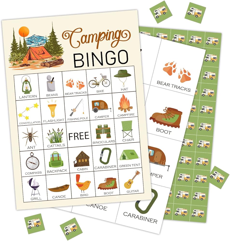 【4】بطاقات ألعاب بينجو لحفلات التخييم، مقاس كل بطاقة 12.7 سم × 17.78 سم.