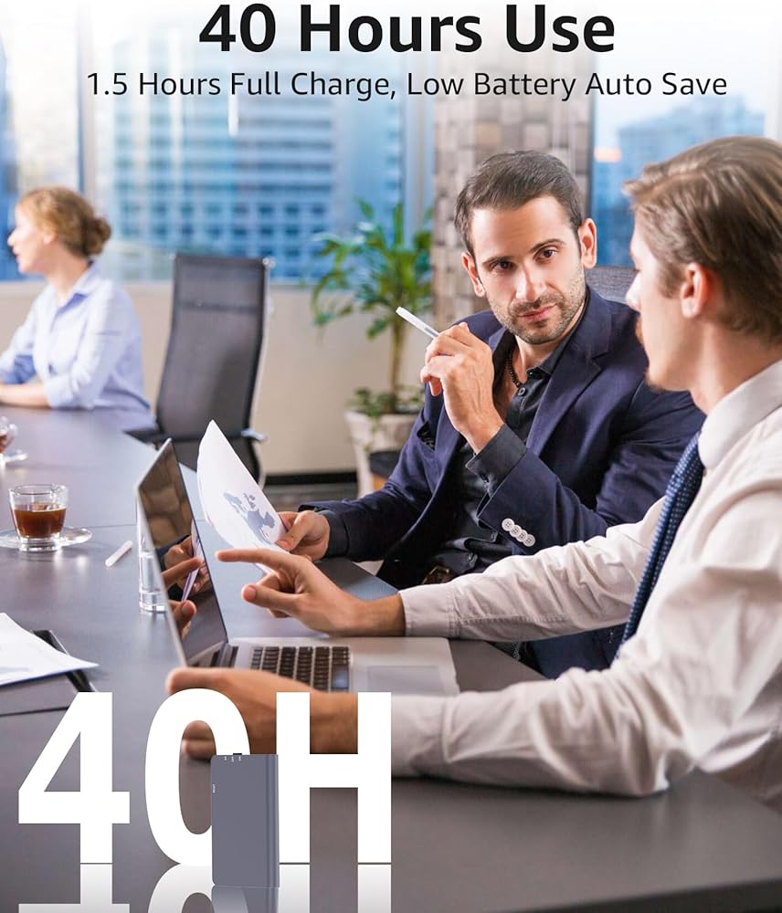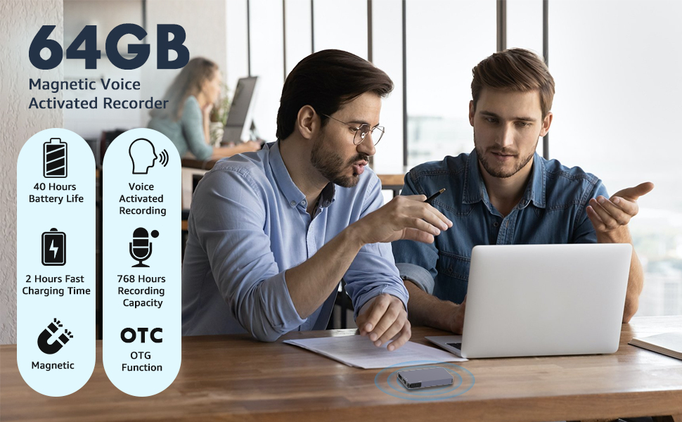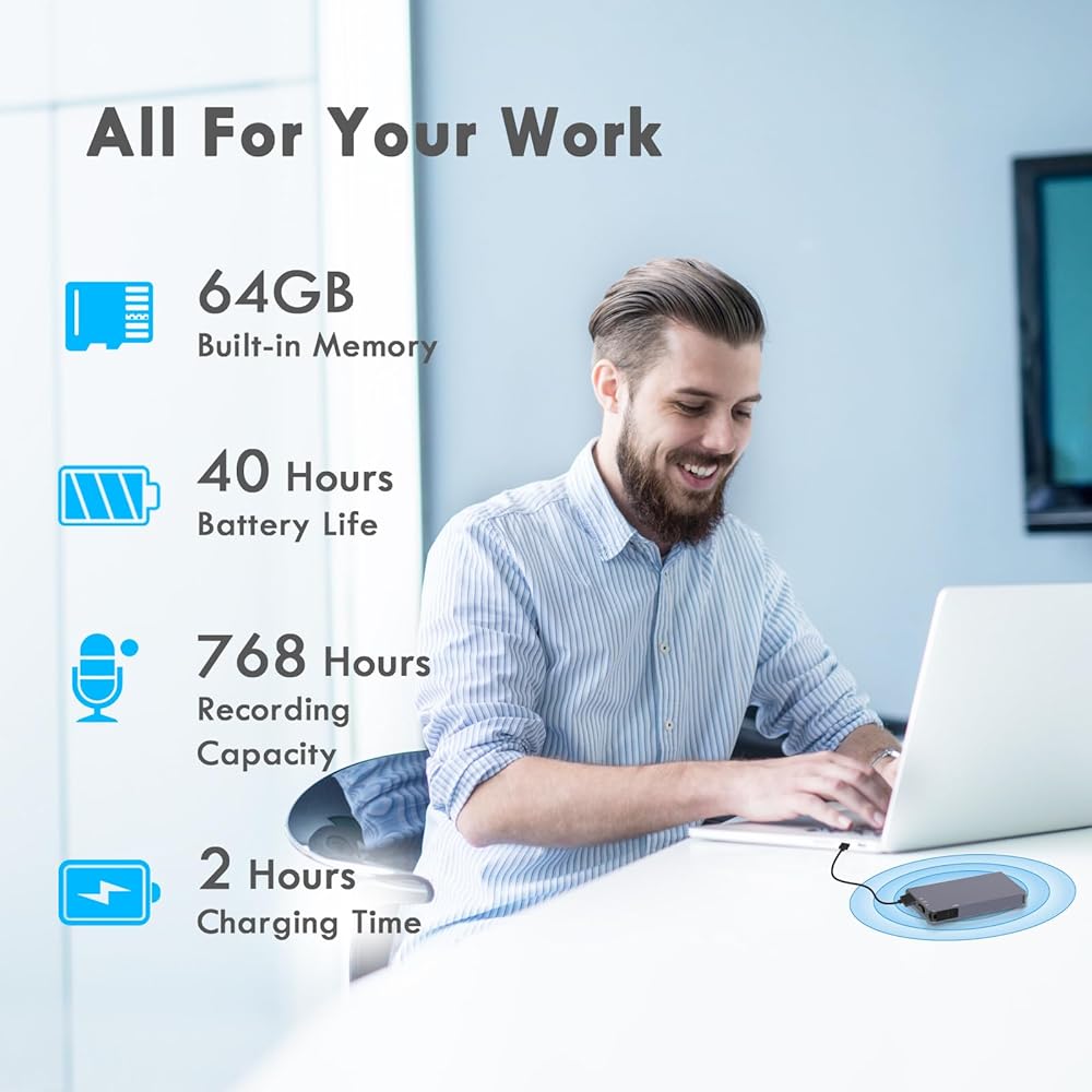 • بطارية طويلة الأمد للغاية: بفضل بطاريتها القابلة لإعادة الشحن الموجودة في مسجل الجيب، يمكنك استخدامها لمدة 40 ساعة بعد الشحن الكامل، ويمكن للذاكرة التي تبلغ سعتها 64 جيجابايت في جهاز المسجل الصغير تخزين ما يصل إلى 768 ساعة من الملفات الصوتية عالية الجودة. يمكن للمسجل الصغير حفظ الملفات الصوتية تلقائيًا عندما تكون البطارية منخفضة.