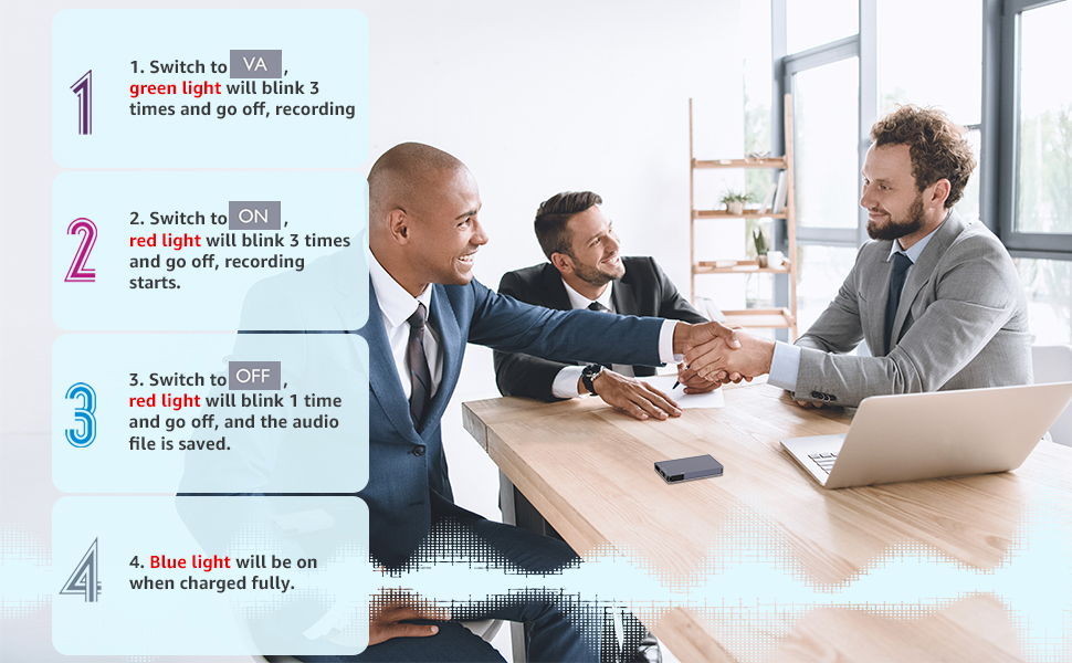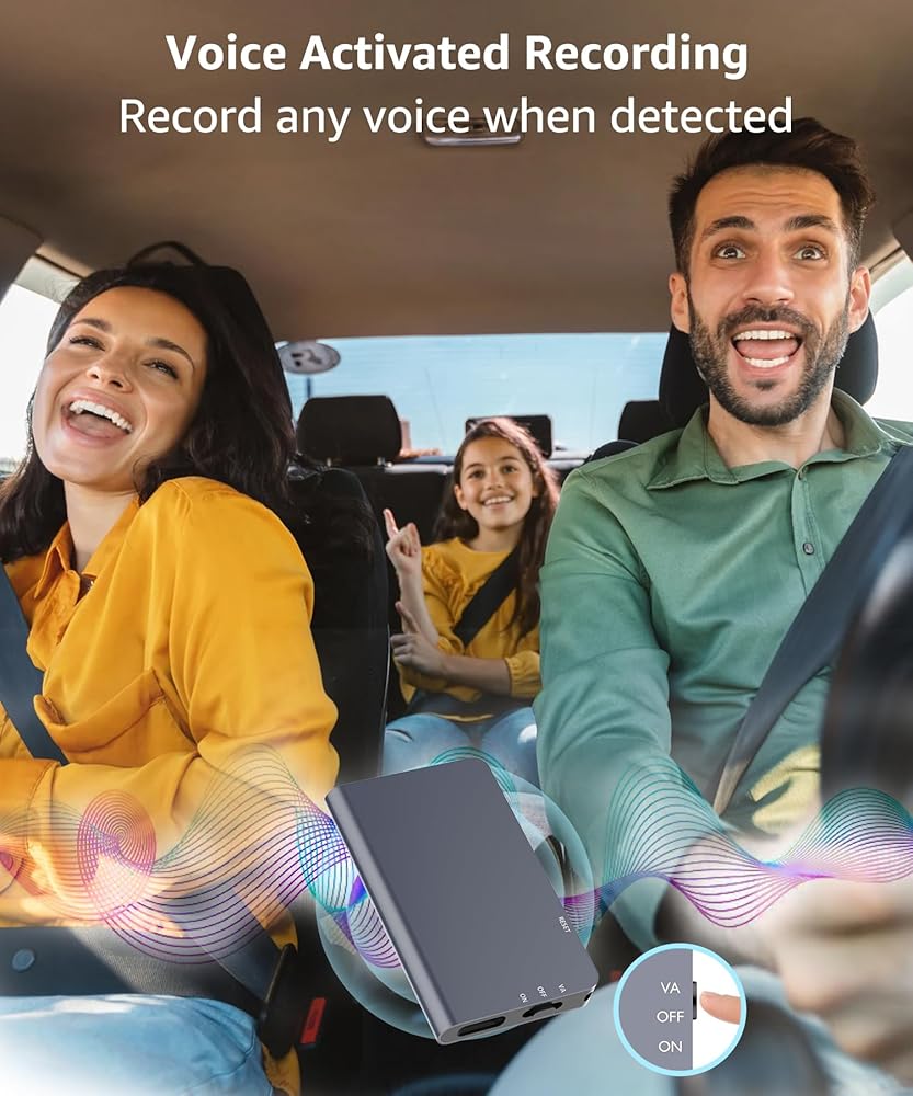 • جهاز تسجيل الصوت المنشط: يمكنك تحريك المفتاح إلى مسجل الصوت المنشط إلى وضع التسجيل الصوتي المنشط (VA). بمجرد أن يكتشف المسجل الرقمي التحدث في مكان قريب، سيقوم المسجل الصغير بتسجيل التحدث تلقائيًا - لا مزيد من الضوضاء في التسجيل الخاص بك ويضمن عدم تفويت أي لحظة مهمة أبدًا. يوجد أيضًا دليل مستخدم يحتوي على تعليمات خطوة بخطوة في العبوة، يرجى التحقق منه!