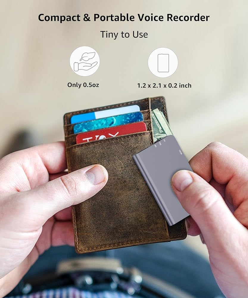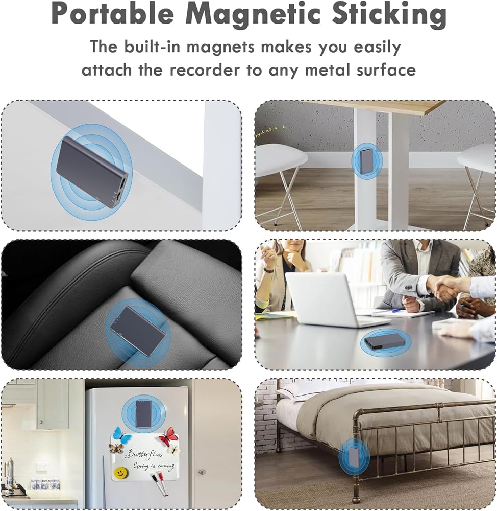 • تطبيق محمول وواسع: مسجل الصوت الصغير الخاص بنا يبلغ وزنه 0.03 رطل فقط وهو عملي وصغير (1.2 × 2.1 × 0.2 بوصة). يمكنك وضع مسجل الصوت الصغير في أي مكان لأي استخدام مثل جيب البنطلون أو محفظتك، أو تعليقه على حقيبة الظهر وسلسلة المفاتيح. تحتوي أجهزة التسجيل الصغيرة على مغناطيسات مدمجة، ويمكن أيضًا ربطها بقوة بمكاتب وكراسي المكاتب والفصول الدراسية وألواح الكتابة والثلاجات والأسطح المعدنية الأخرى، وتستخدم على نطاق واسع في الفصول الدراسية والاجتماعات والمحاضرات والمقابلات. (يرجى ملاحظة الجانب فقط مع الكلمات المغناطيسية)
