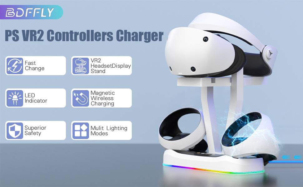 محطة شحن BDFFLY للبلاي ستيشن VR2، قاعدة شحن عمودية مع دعم ضوء RGB للتنفس لحامل عرض PSVR2 لحامل PS VR2 مع 4 محولات مغناطيسية من النوع C لوحدة التحكم بالحواس