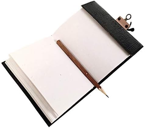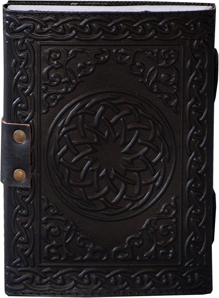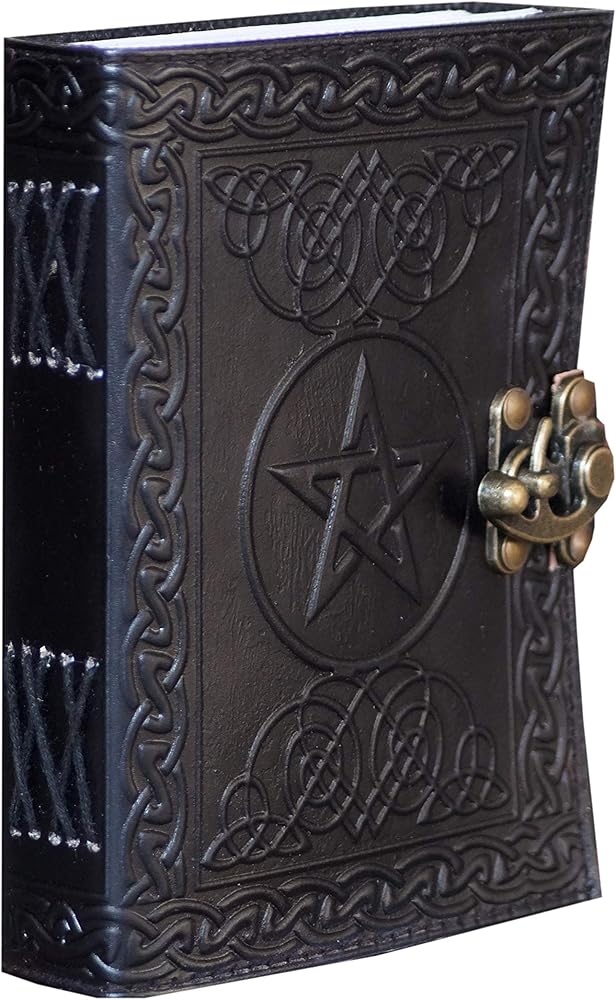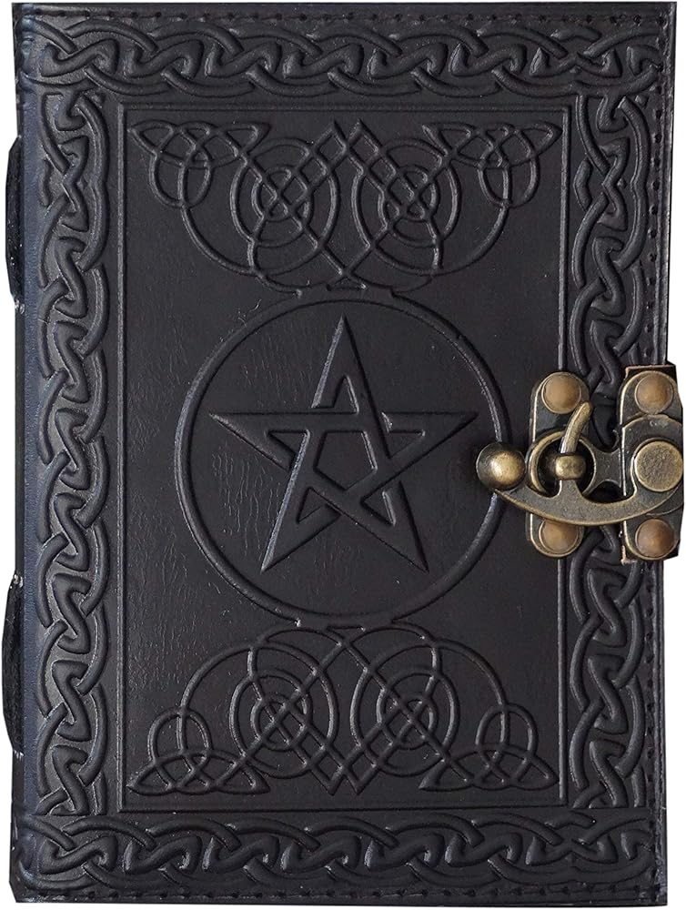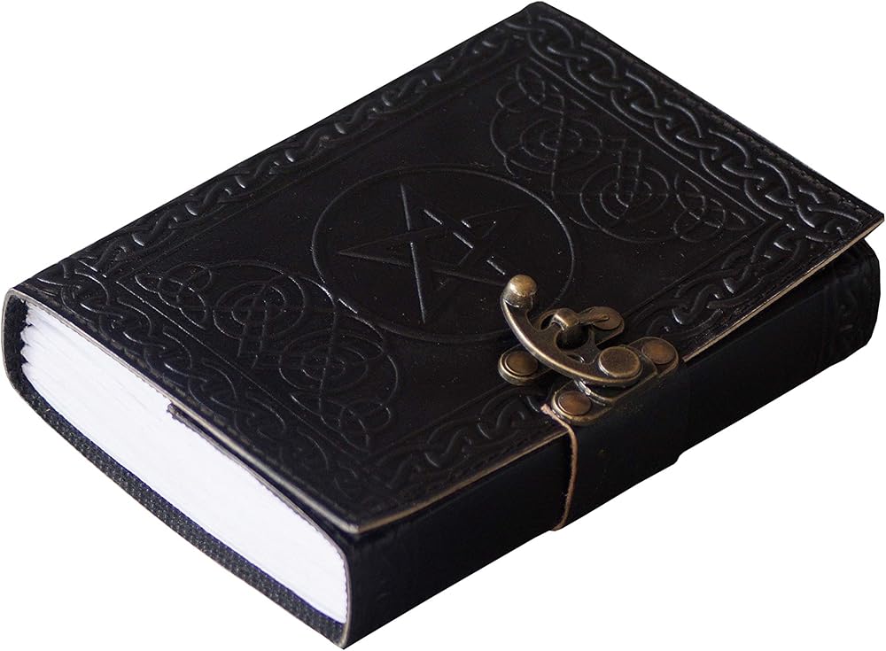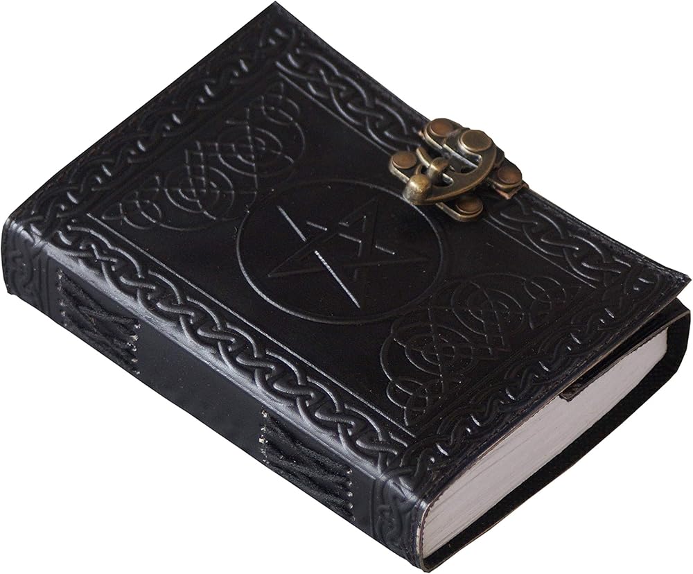 Pentagram Leather Journal Black Pentagram Embossed Blank Spell Book of Shadows Journals with Lock Clasp Pentacle Wicca Pagan Witchcraft Unlined Paper Notebook is very beautifully embossed and hand made 120 leaves (240 pages) notebook features a brown leather binding, with embossed designs on both front and back. Our Wiccan/Pagan inspired handmade leather journal is a great tool for anyone wanting to record inspired thoughts, mystical moments, and potential rituals and recipes. Handmade in India, our journals are influenced by symbolism that is derived from the Wiccan/Pagan community, creating a personalized space where your inner creative genius can flourish. Sketchbook is very good for keeping by the bedside to jot down dreams, or for use as a diary or journal. Notebook has an antique vintage C-Lock brass swing clasp to keep your secrets from prying eyes. Handcrafted journals contain acid less, handmade, archival Quality, linen - cotton parchment paper by a family owned company that has been in the handmade paper making business for almost 150 years. The book is approximately 7 inches tall, 5 inches wide, and 1.2 inches thick, and the pages are unlined. This brand new journal makes an ideal present for that special someone or simply to keep for yourself. (Due to computer screen resolution color shades of product may slightly vary from images shown.)