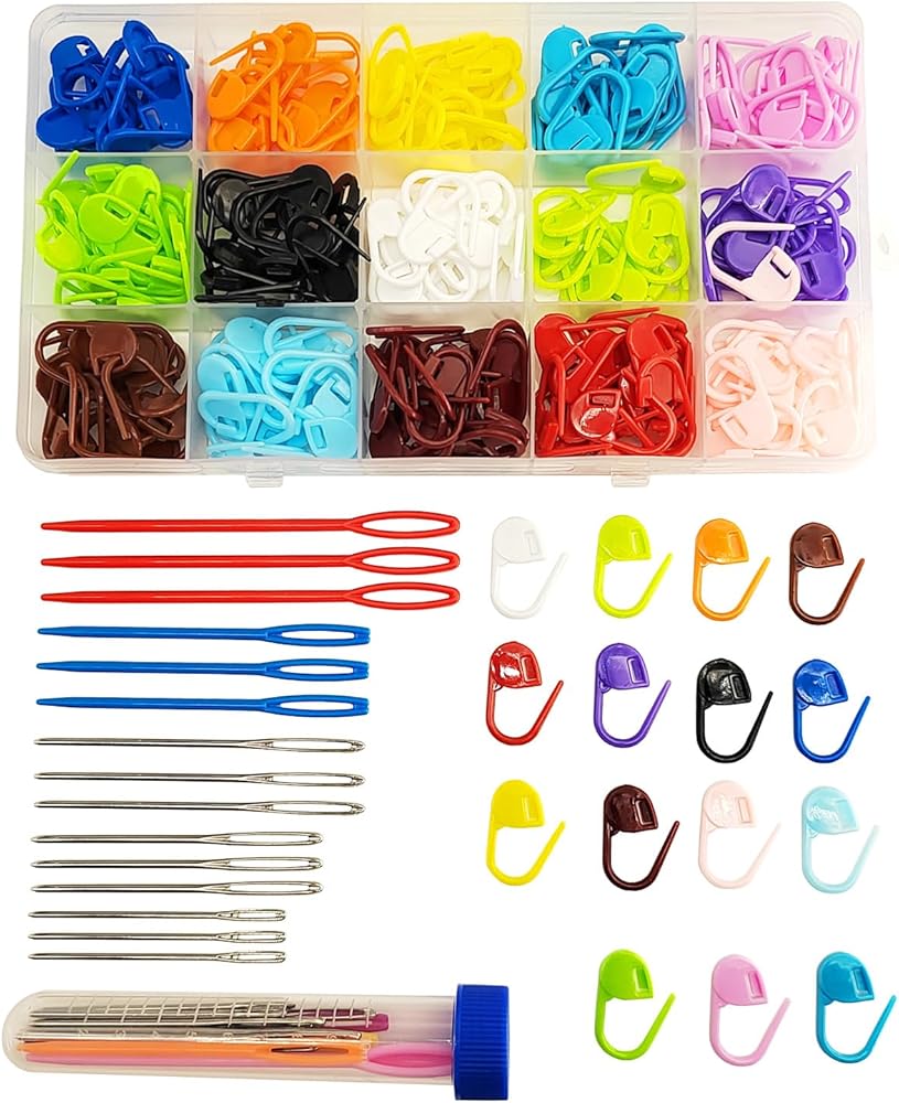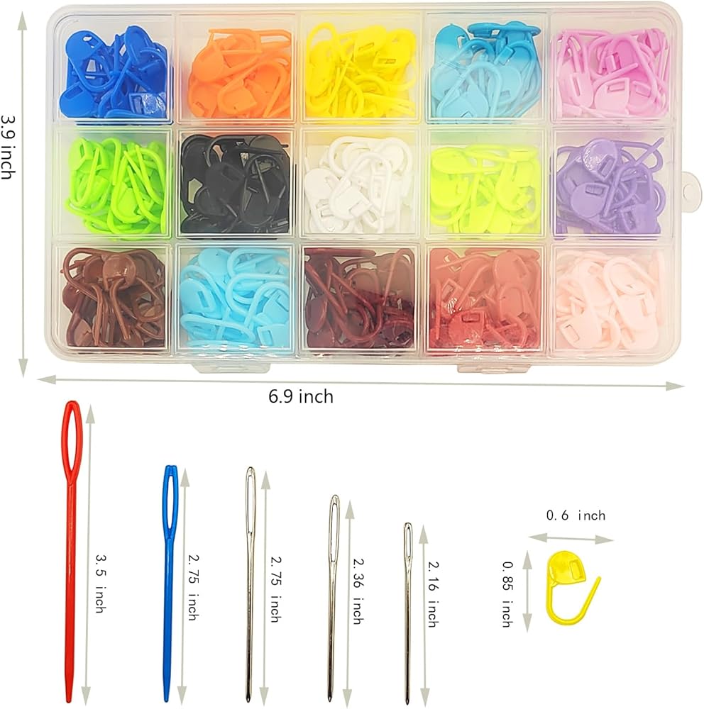 300 pieces plastic mark stitches in 15 colors, each color for 20 pieces. 15 pieces big eye yarn needles(9 * large eye blunt metal sewing needles & 6 * large eye plastic needles).
