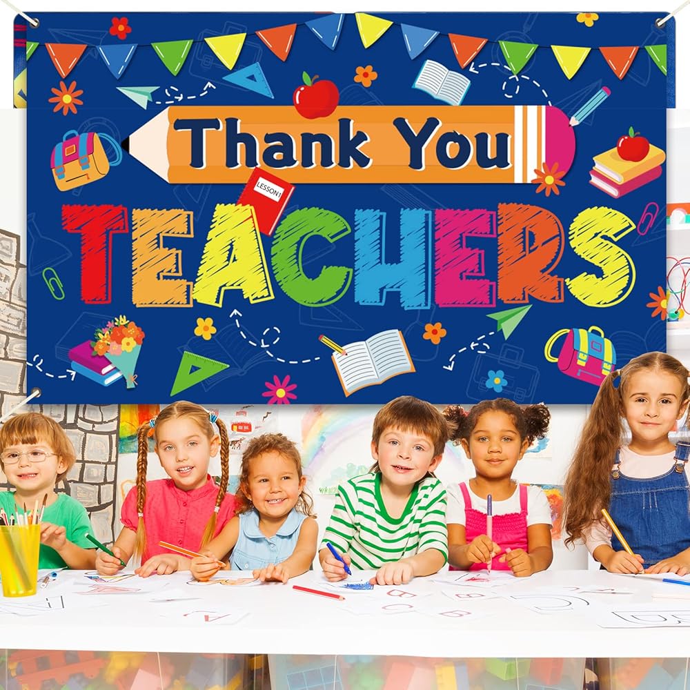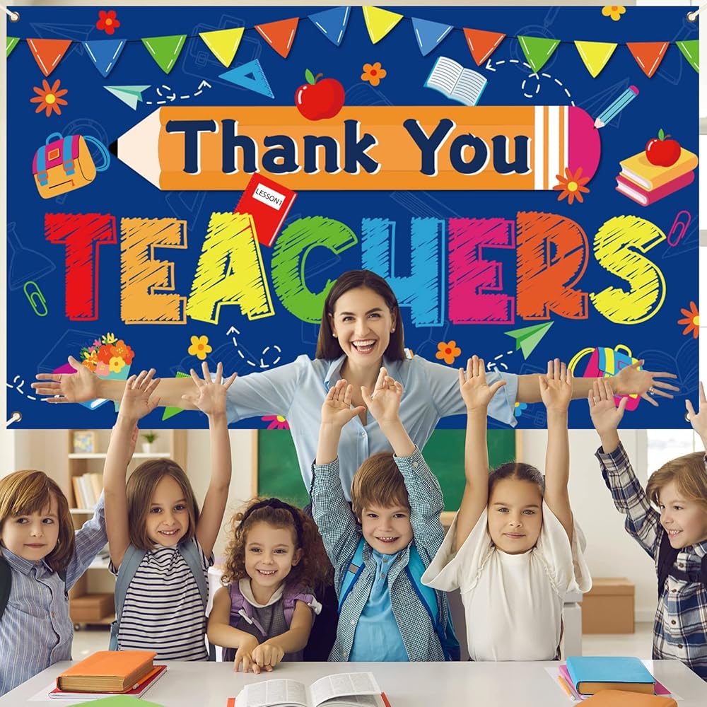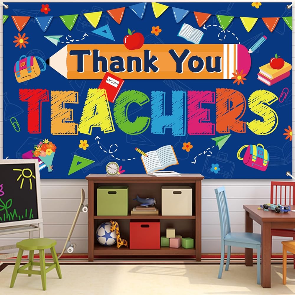 【ما تحصل عليه 】عبوة واحدة من لافتة شكرًا للمعلمين مع شريط طويل للتعليق بسهولة. عبّر عن حبك للمعلمين. تتميز خلفية لافتة حفل تقدير المعلم هذه بلوحة إعلانات - رسم مستوحى من أجل ديكورات حفلات تقدير المعلم.
