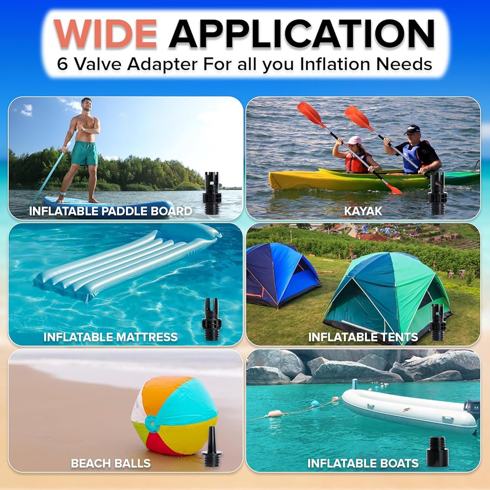 مضخة هواء متعددة الاستخدامات - إلى جانب ألواح SUP، تتوافق مضختنا أيضًا مع المطاطية التقليدية مثل قوارب الكاياك والقوارب القابلة للنفخ والخيام وكرات اليوجا. لقد قمنا بتضمين 7 فوهات محول مختلفة لراحتك.