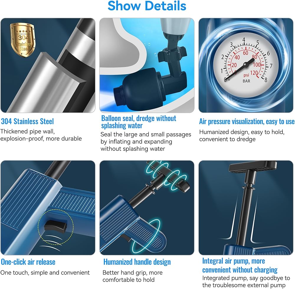 مكبس المرحاض، مكبس تصريف الهواء من الفولاذ المقاوم للصدأ للمراحيض المسدودة، مكبس مرحاض عالي الضغط عالي التحمل، للحمام، تصريف الأرضية، الحوض، المطبخ (أزرق) (1)