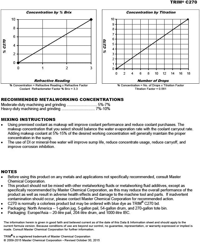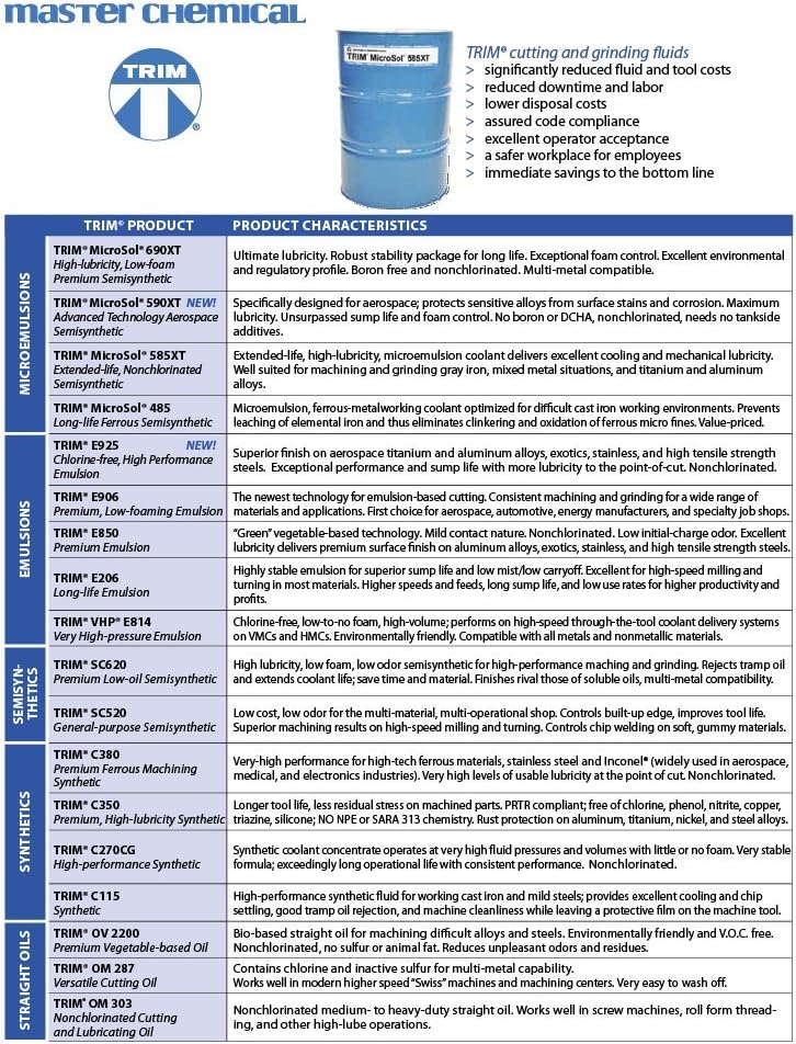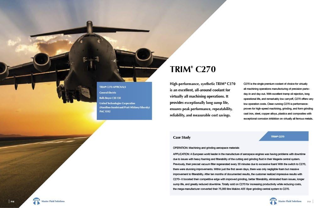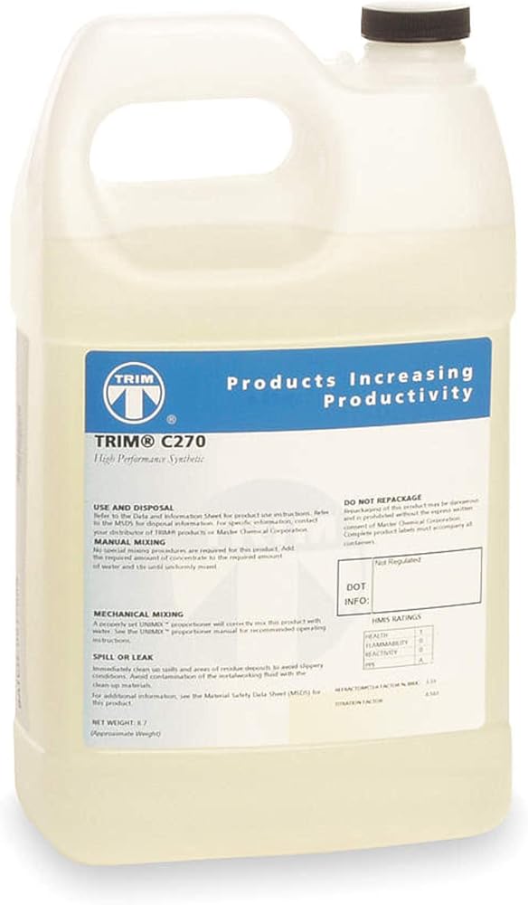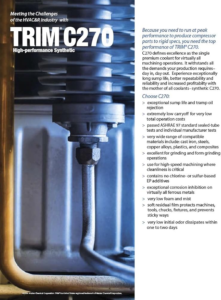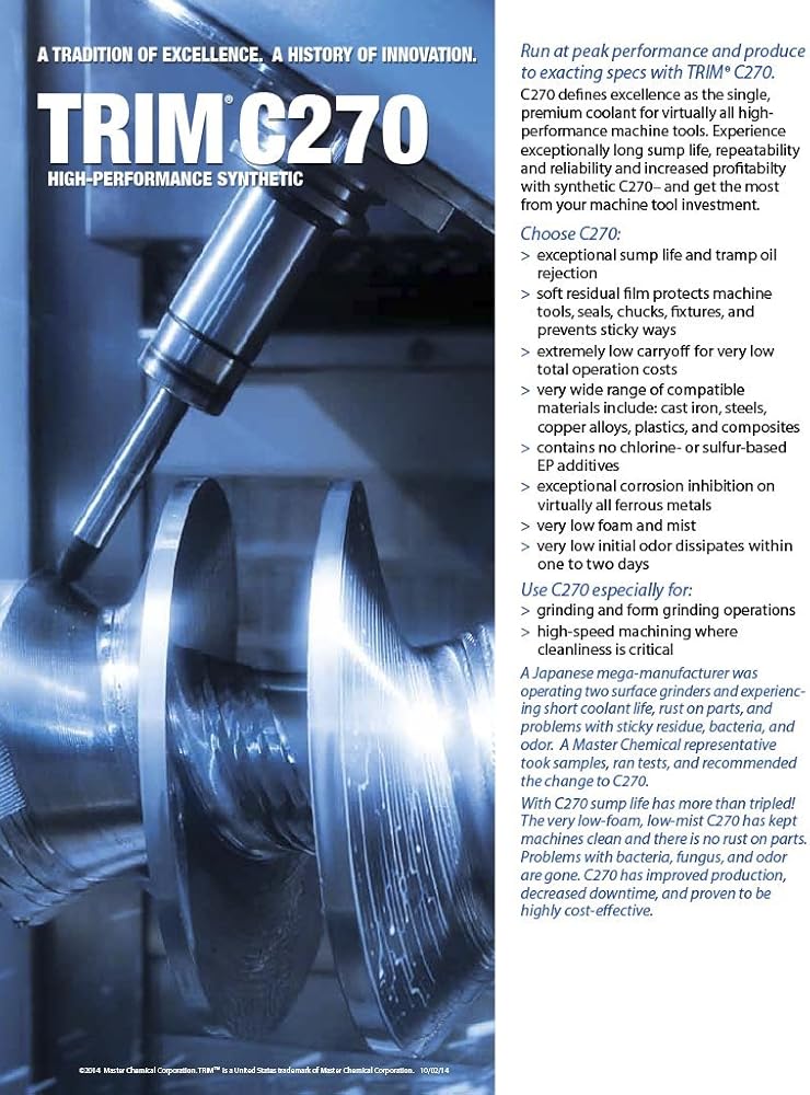 TRIM C270 is a state-of-the-art synthetic coolant. C270 provides excellent cooling and chip settling, good tramp oil rejection, and machine cleanliness, and meets the need of the modern job shop for a single premium synthetic coolant for virtually all machining operations.