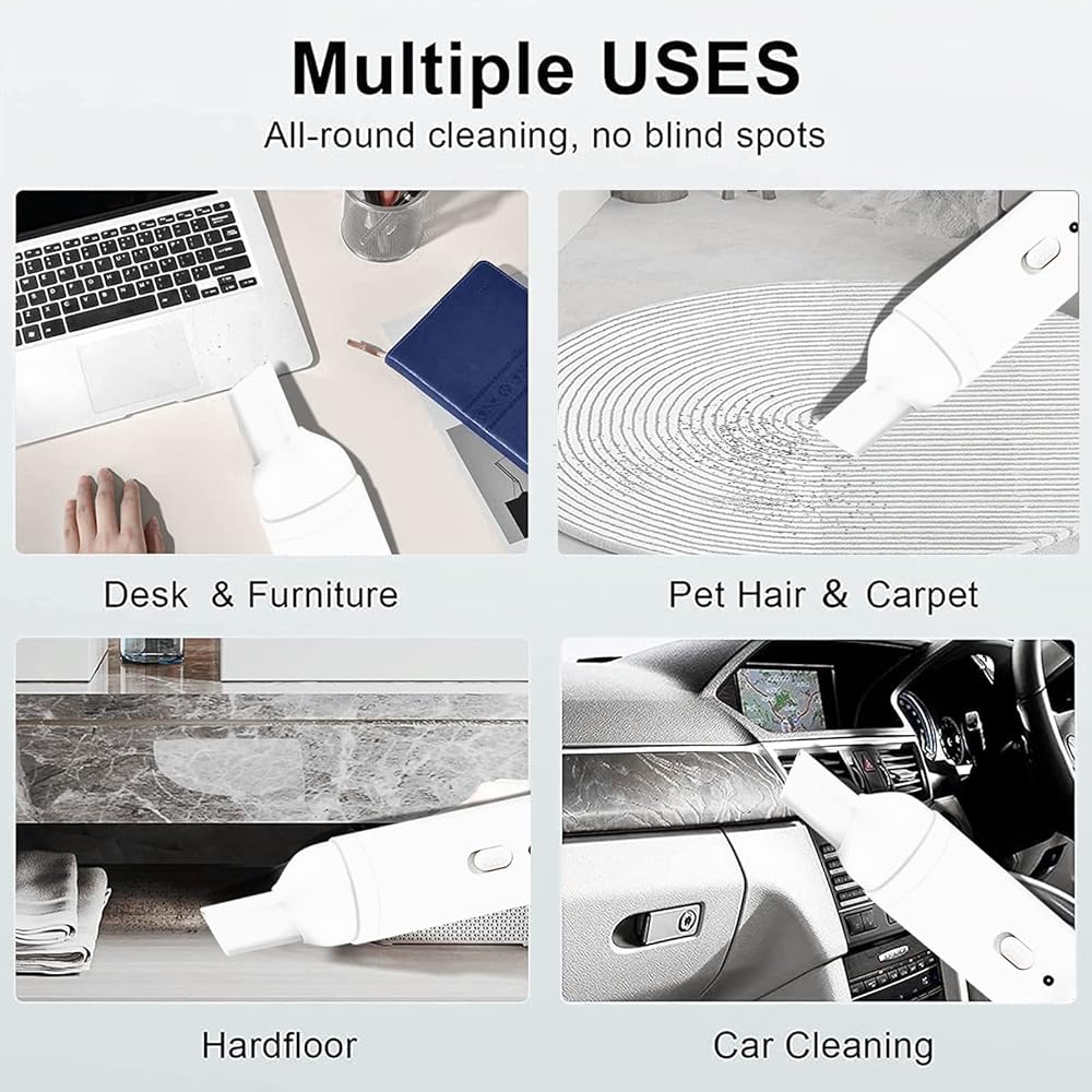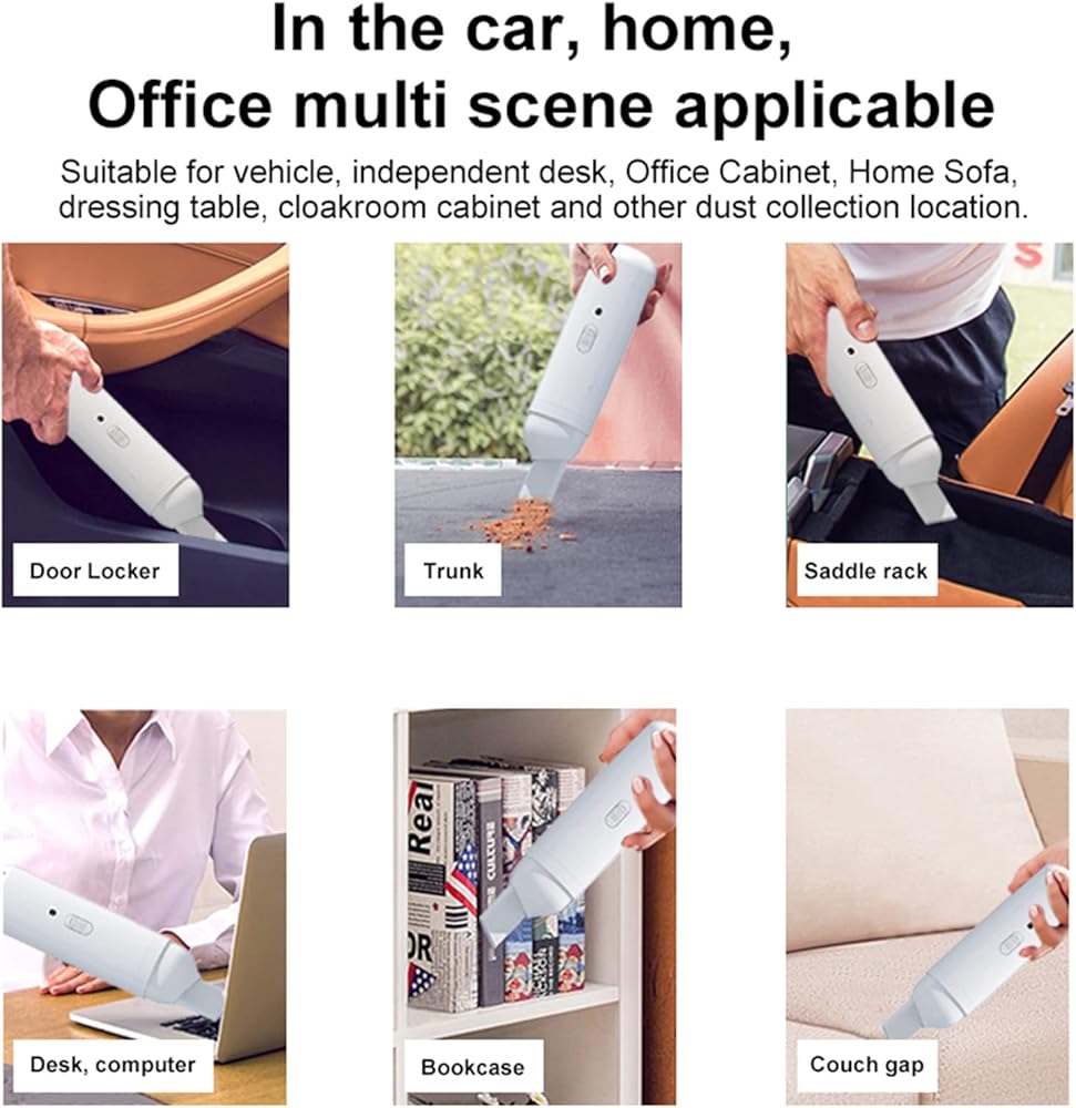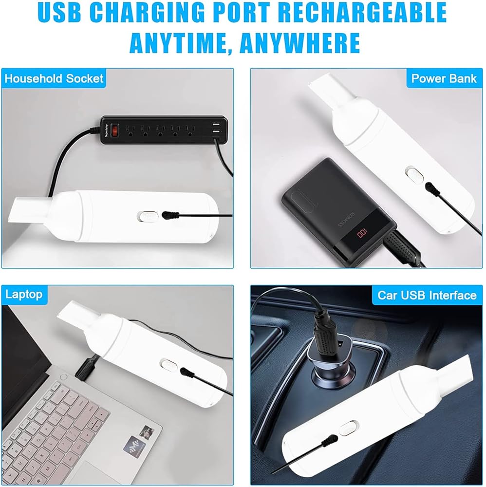 【تصميم محمول】 مكنسة السيارة القابلة لإعادة الشحن خفيفة الوزن للغاية، تزن 0.17 رطل، سهلة الحمل، 5.7 بوصة فقط. ستكون يديك أقل تعبًا ويمكنك تخزينها في أي مكان تقريبًا في سيارتك! كابل شحن USB يجعل الشحن أسهل.