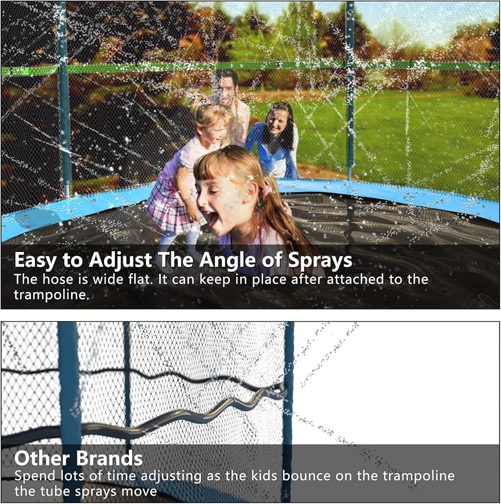 Kink Resistant: This sprinkler for tramploine is made of much harder and thicker materials. It will be in shape after zip tied to the trampoline net. No kinks to stop the water flow. No need to adjust the angle of spray every few minutes as the kids bounce on the trampoline other sprinkler moves.