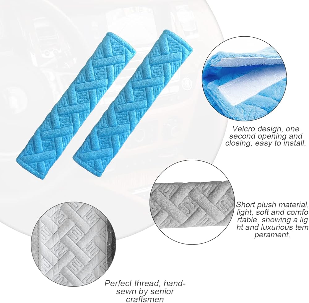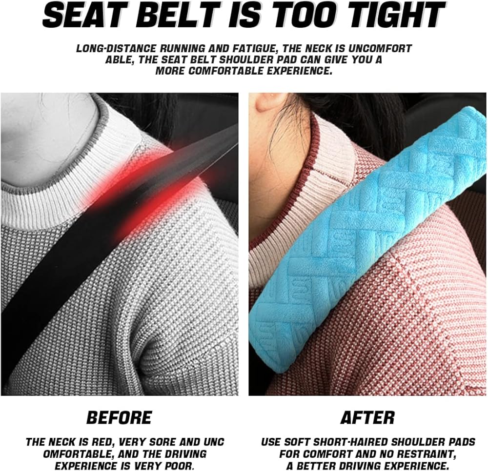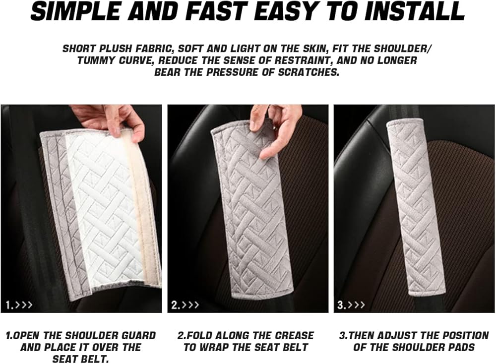 • سهل الاستخدام - مريح جدًا للتثبيت في دقيقة واحدة. تحتوي على اثنين من الفيلكرو المتين، افتح الفيلكرو، ثم افتح وسادة الكتف، ثم ضع حزام الأمان في منتصف وسادة الكتف، وألصق الفيلكرو معًا، واكتمل التثبيت. كما أنها سهلة التعديل، كما أن وسادة الحزام قابلة للإزالة والغسل.