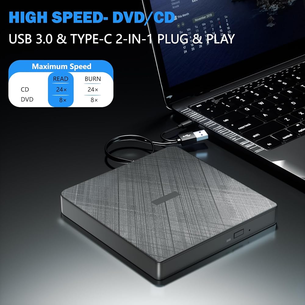 أداء عالٍ: يتمتع محرك الأقراص المضغوطة USB الخارجي بقدرات أداء عالية مذهلة. تتميز واجهة 3.0 المتطورة عالية السرعة وواجهة Type-C بقدرات استثنائية على تصحيح الأخطاء، ومقاومة الصدمات، وانخفاض مستوى الضجيج، وانخفاض استهلاك الطاقة. يمكنه قراءة الأقراص المضغوطة بسرعة تصل إلى 24x وأقراص DVD بسرعة تصل إلى 8x. متوافق مع الإصدارات السابقة مع USB2.0 وUSB1.0.