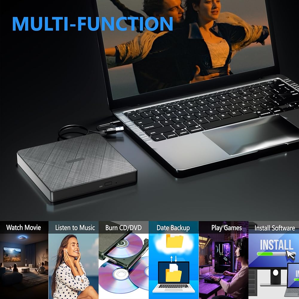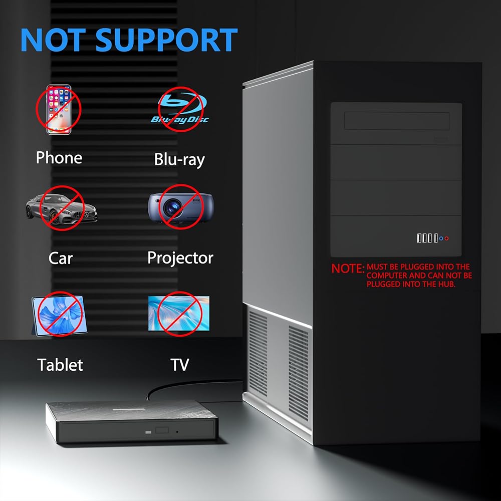التوصيل والتشغيل: سهل الاستخدام، يتم تشغيل محرك الأقراص المضغوطة الخارجي بواسطة منفذ USB. ليست هناك حاجة إلى سائق إضافي وقوة. ما عليك سوى توصيل محرك أقراص DVD الخارجي بمنفذ USB المباشر على جهاز الكمبيوتر الخاص بك وسيتم اكتشاف مشغل DVD للكمبيوتر المحمول.