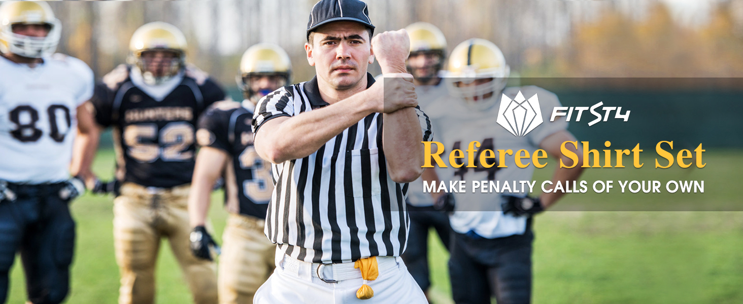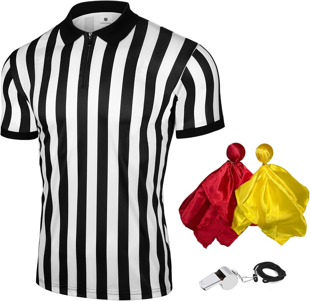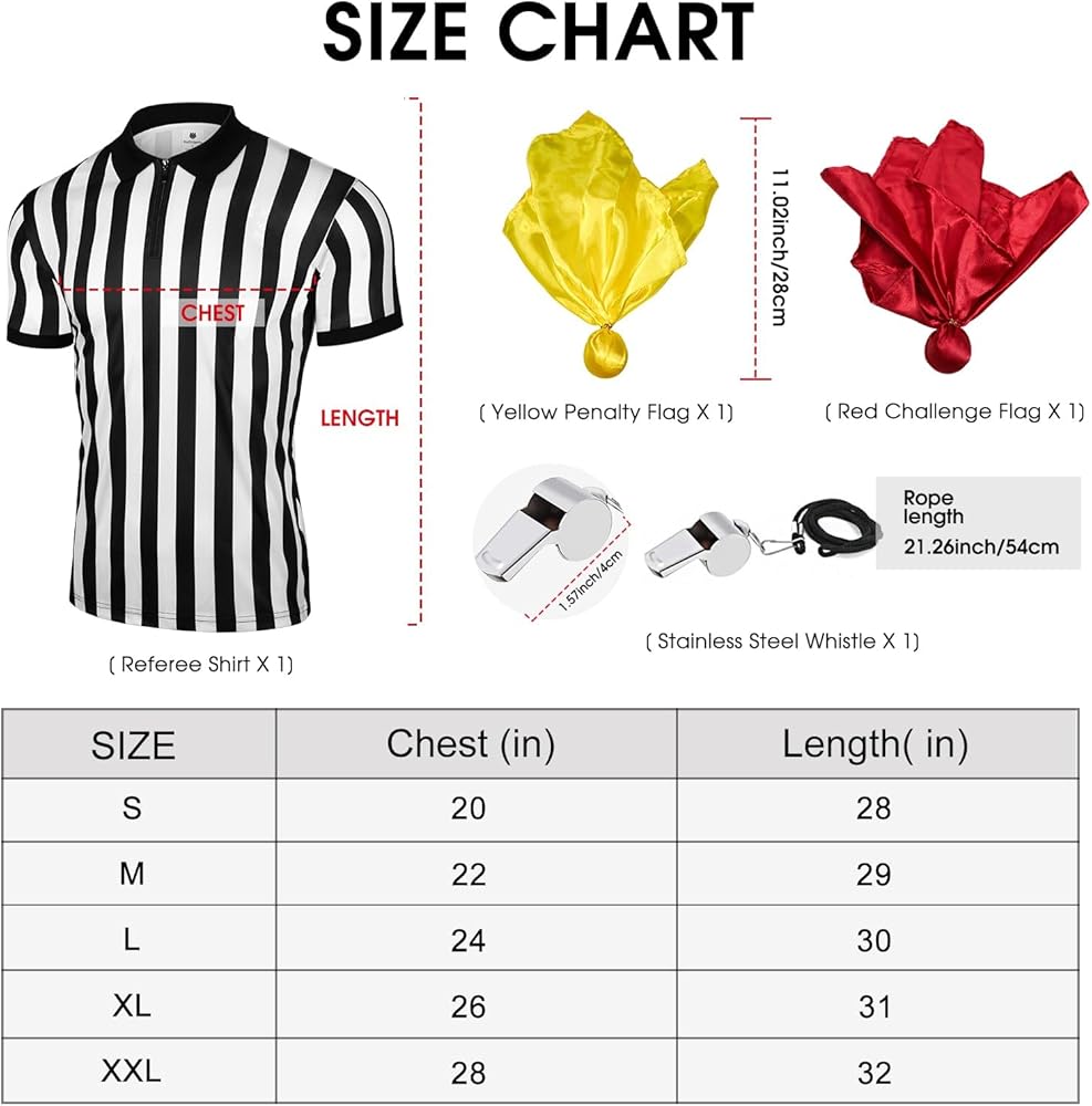 مجموعة حكم مكونة من 4 قطع - تحتوي مجموعة قمصان الحكم هذه على قميص حكم مخطط باللونين الأسود والأبيض، وصفارة من الفولاذ المقاوم للصدأ، وعلم جزاء أصفر وعلم تحدي أحمر. سيجعلك هذا الزي تبدو رسميًا عندما تخطو إلى الملعب