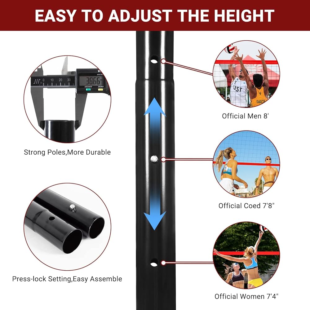 🏸【ارتفاع قابل للتعديل】يمكن تعديل 3 ارتفاعات لتلبية احتياجات الأشخاص المختلفين، الارتفاع الرسمي 8 أقدام للرجال، 7 أقدام و8 بوصات للطلاب و7 أقدام و4 بوصات للنساء. مجموعة الكرة الطائرة رائعة للشباب والكبار.