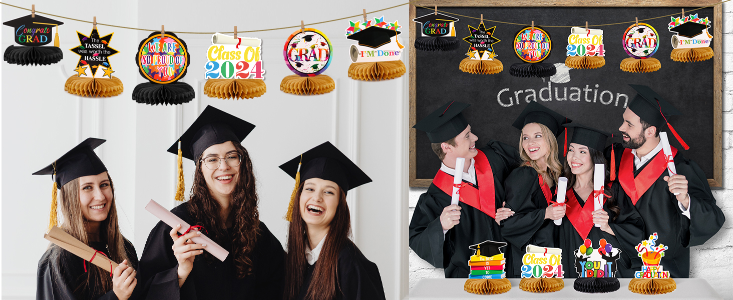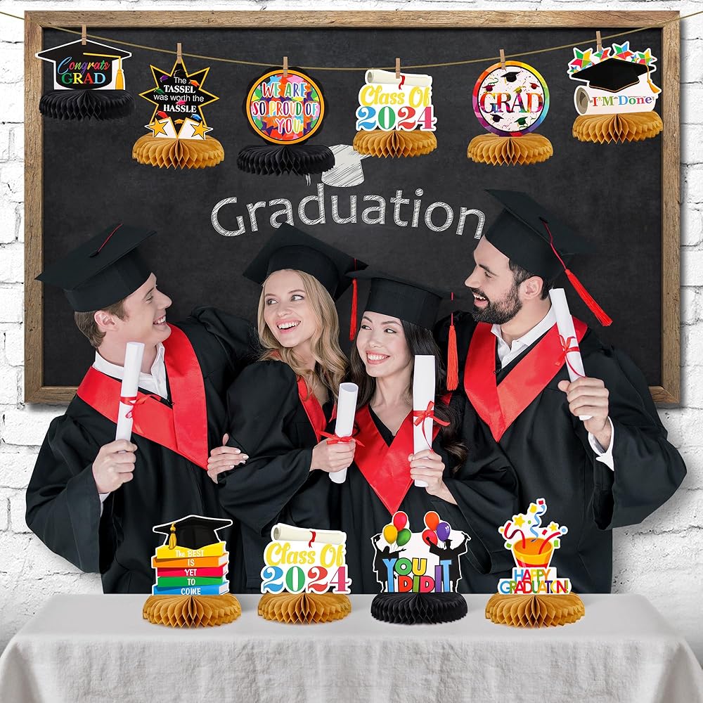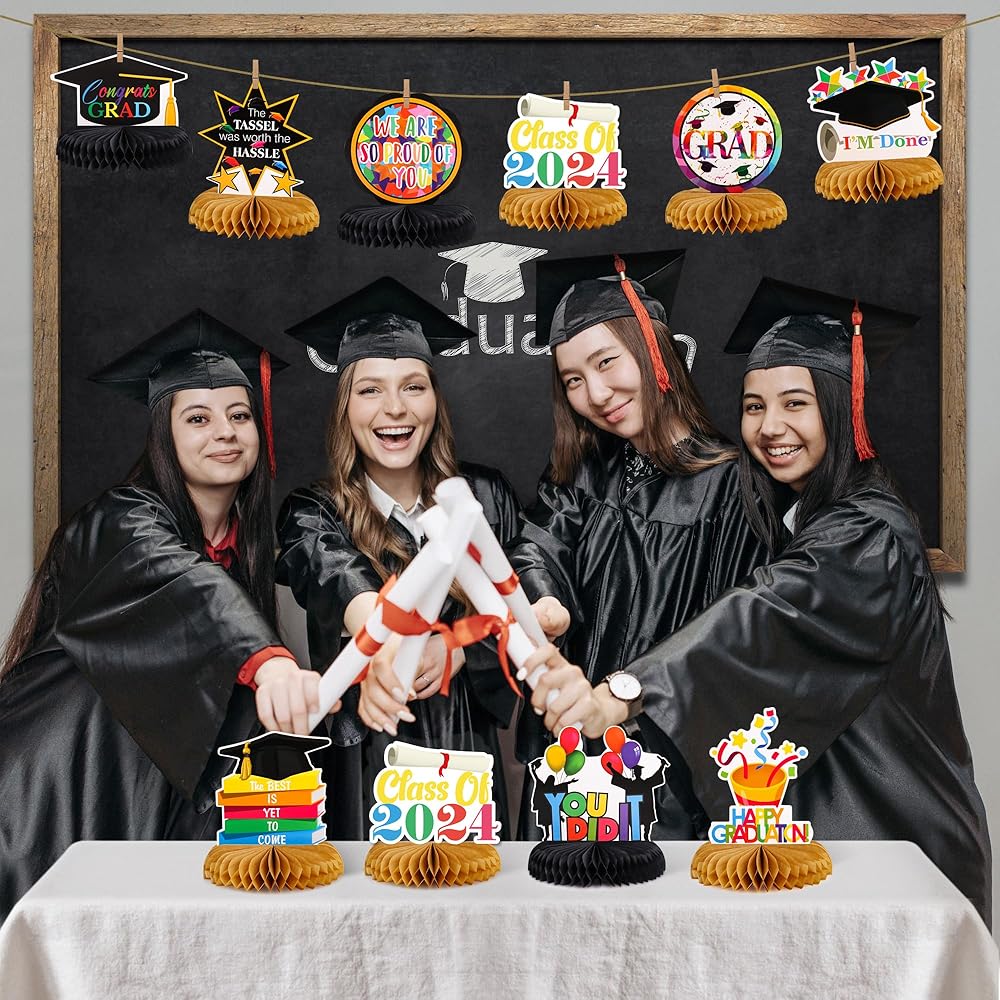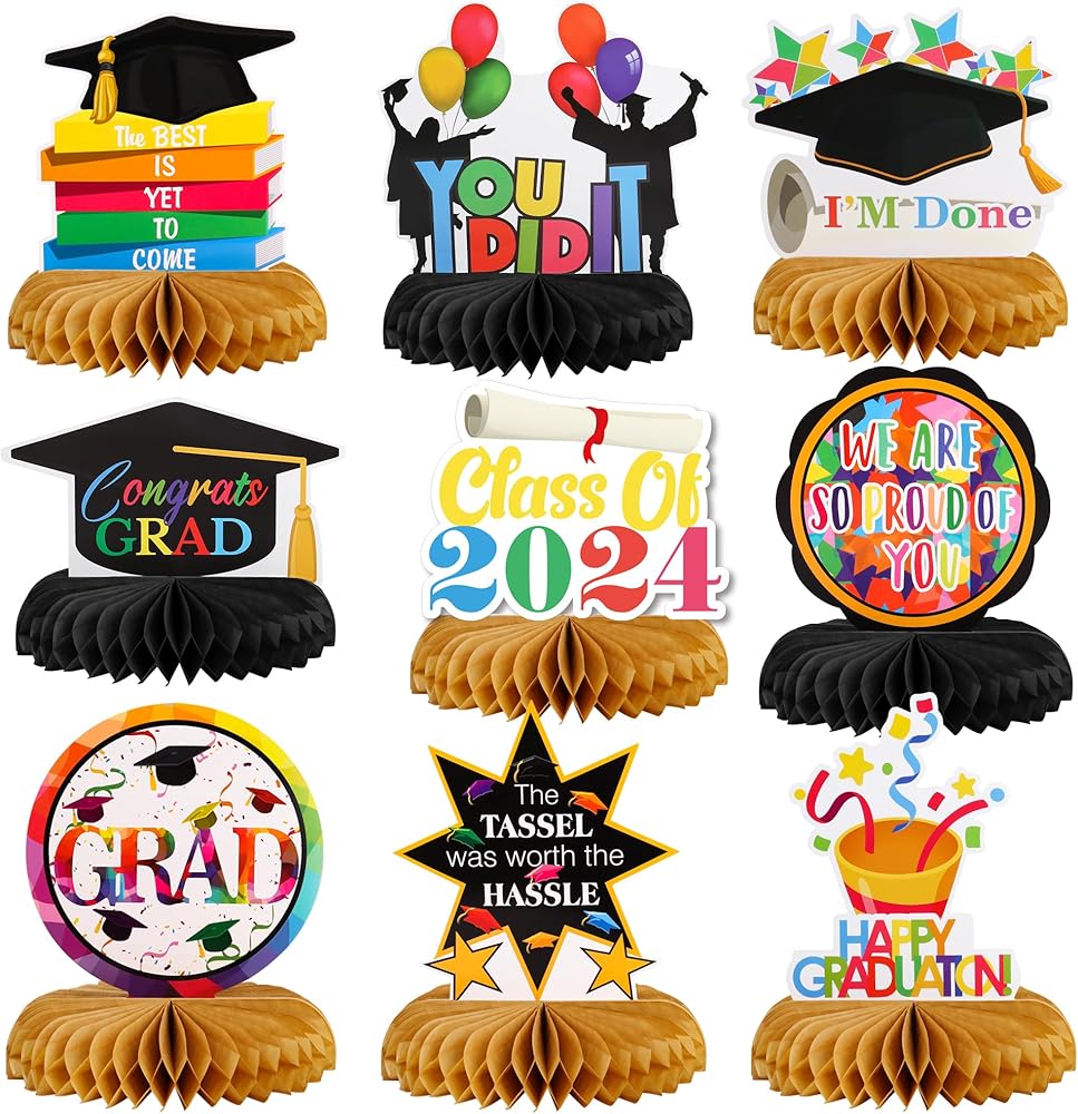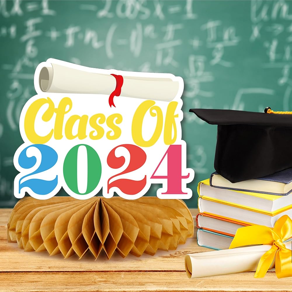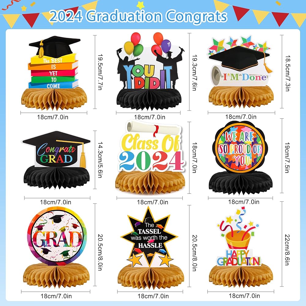 مجموعة كبيرة ومتنوعة من القطع المركزية الملونة للطاولة تتميز بدبلوم و"فئة 2024"، و"Congrats Grad"، و"YOU DID IT!"، و"نحن فخورون جدًا بك"، وطباعة "Happy Graduation" وما إلى ذلك. وهذا سوف يكمل عام 2024 الخاص بك ديكورات سنتربيس التخرج. هذه القطع المركزية على شكل قرص العسل من تهنئة التخرج مطبوعة على الوجهين لأي ديكورات حفلات تحت عنوان التخرج 2024.