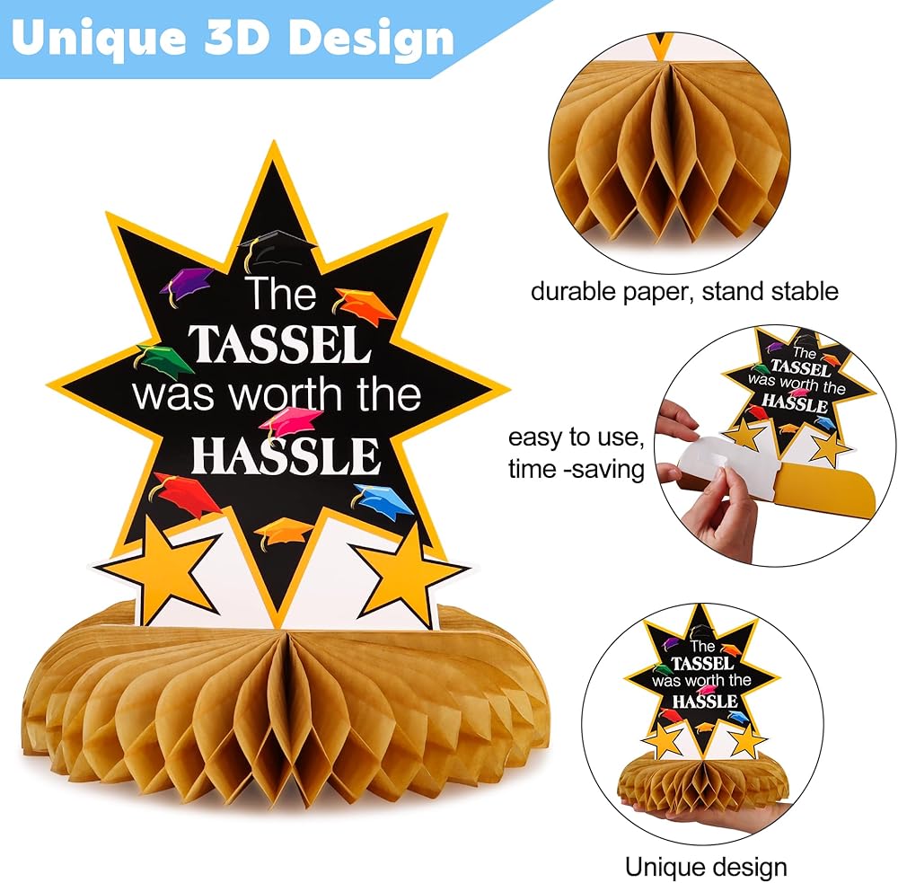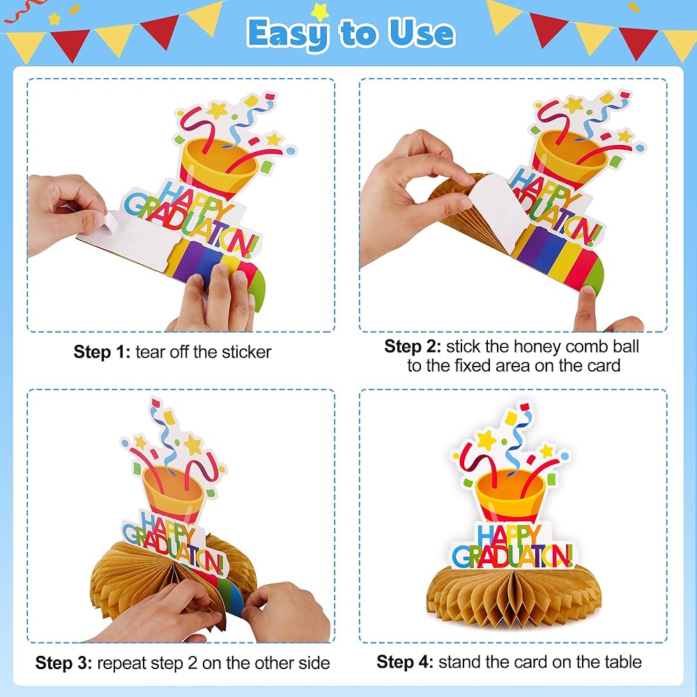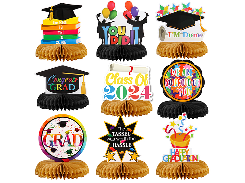 هذه القطعة المركزية للطاولة متعددة الألوان، وبشكل أساسي على شكل قبعة، ونجوم، وثوب أكاديمي، وكأس، ودبلومات، وبروش التخرج وغيرها من الأنماط المتعلقة بالتخرج. ملونة جدًا، احتفالية جدًا! قم بتزيين طاولة حفل التخرج الخاصة بك بهذه القطعة المركزية الملونة على شكل قرص العسل لتجعل حفلتك مليئة بأجواء الاحتفالات!