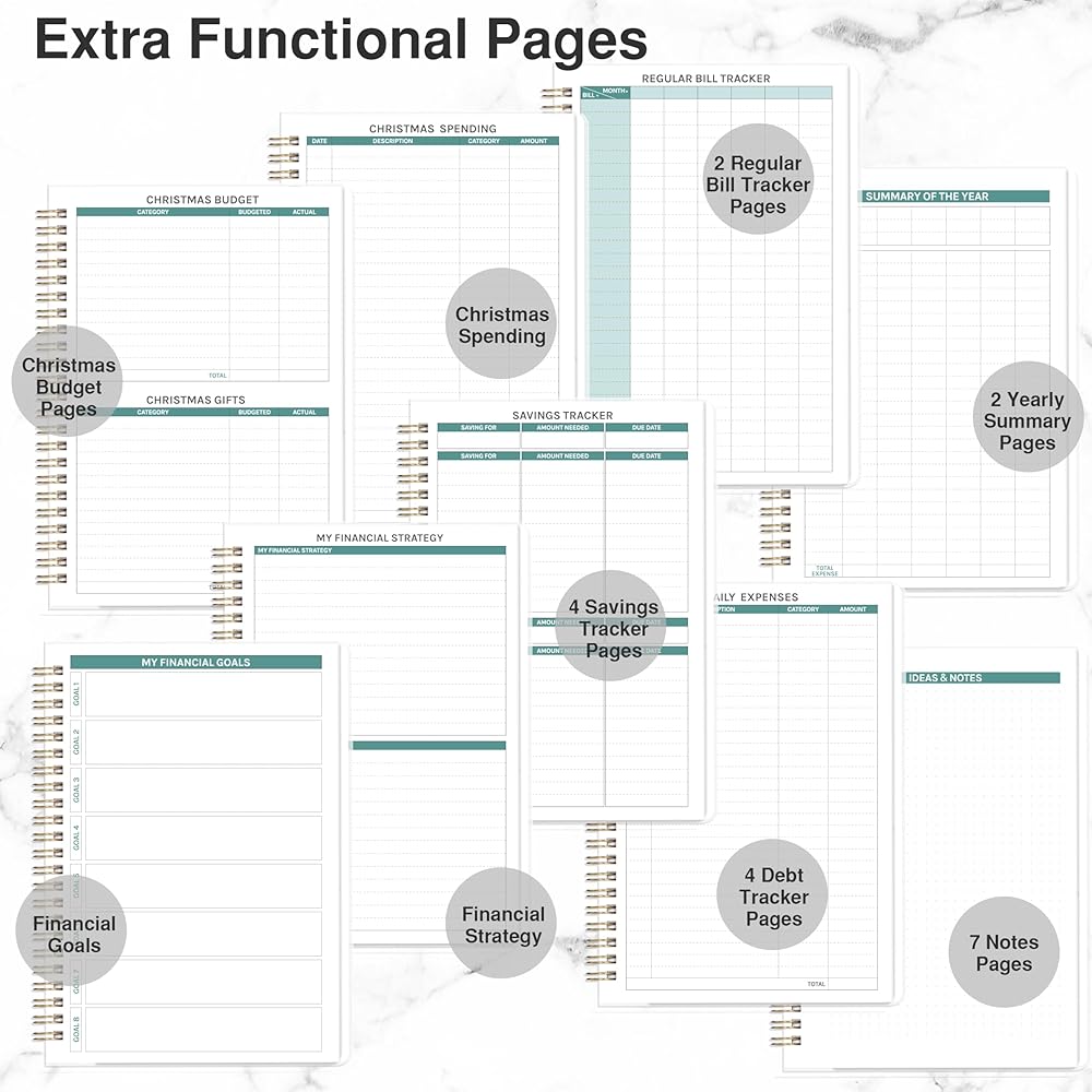 • صفحات وظيفية إضافية - يضيف مخطط الميزانية 9 صفحات وظيفية إضافية لمساعدتك على تحمل مسؤولية أموالك بشكل أفضل، بما في ذلك الأهداف والاستراتيجية المالية، و4 صفحات لتتبع التوفير، و4 صفحات لتتبع الديون، وصفحات لميزانية عيد الميلاد، وصفحتين لتتبع الفواتير العادية، و2 صفحات ملخص سنوية و7 صفحات ملاحظات. من المؤكد أن كتاب الميزانية هذا يمكن أن يرشدك إلى التحكم في أموالك بشكل أكثر فعالية.