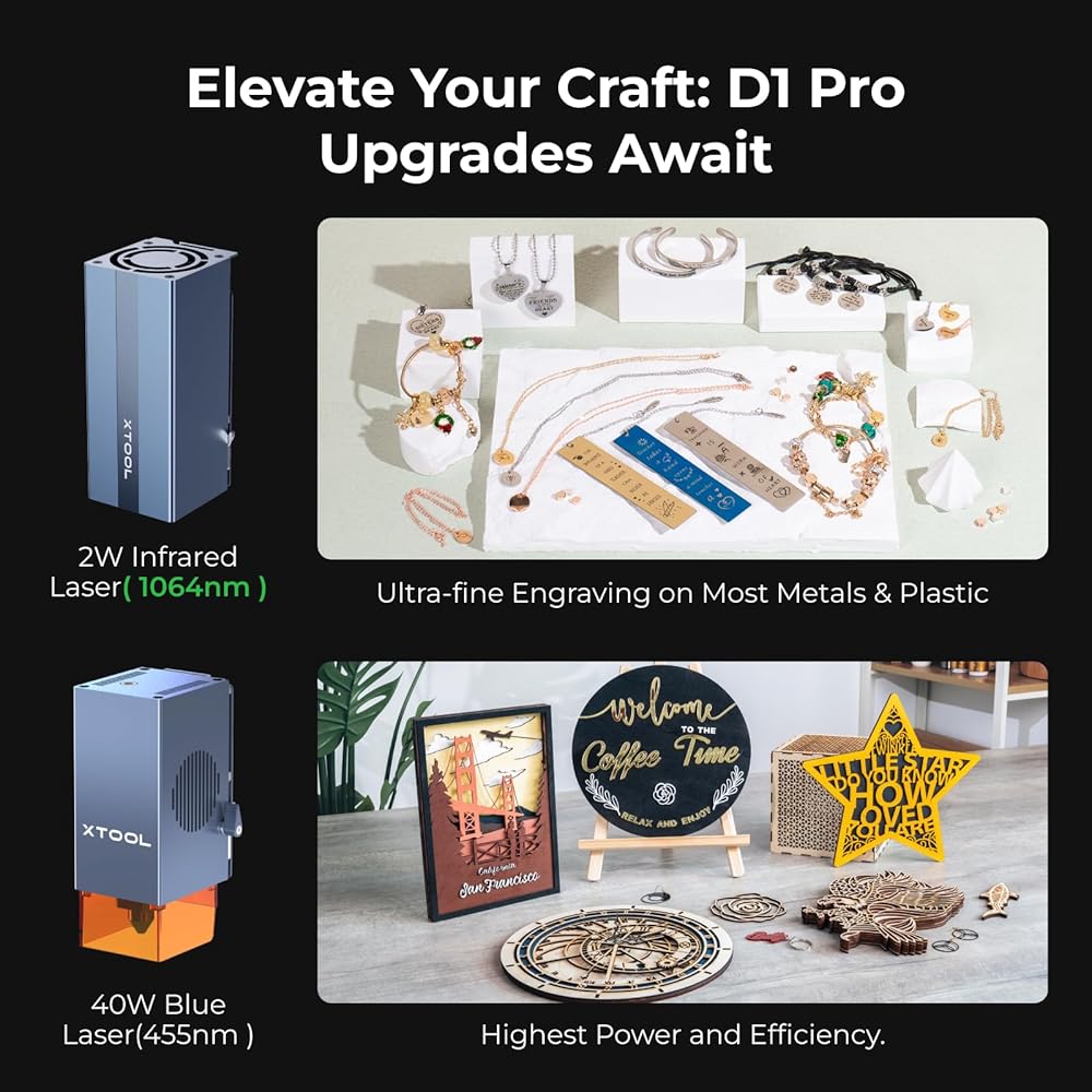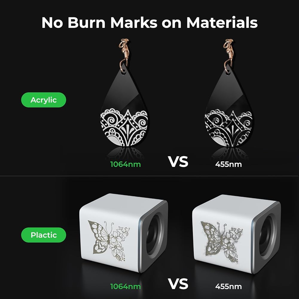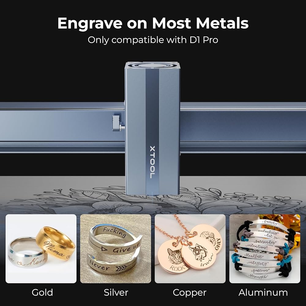 قم بترقية D1 Pro الخاص بك إلى Jewelcrafting Master: تم إنشاء وحدة الليزر بالأشعة تحت الحمراء 1064 نانومتر لنقش المجوهرات. يمكن النقش على جميع المعادن، بما في ذلك الذهب والفضة والنحاس والألمنيوم والزنك وما إلى ذلك، وهو ما لا تستطيع آلة النقش بالليزر ذات الصمام الثنائي الأزرق D1 Pro القيام به. يمكن أن تعمل أيضًا على البلاستيك والأكريليك والجلود وطلاء السيراميك وما إلى ذلك. [ملاحظة: وحدة الليزر متوافقة فقط مع D1 Pro]