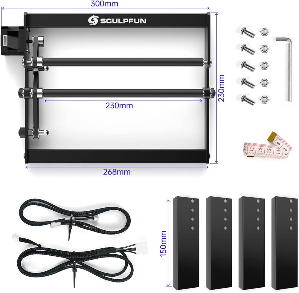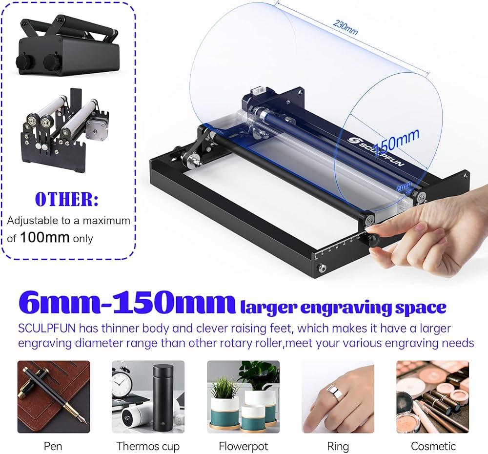 • 【مساحة نقش أكبر】تصميم قاعدة الأسطوانة SCULPFUN أقل ومستقر، ومجهز بـ 4 أقدام معدنية متينة للرفع؛ بحيث يكون قطر النقش أكبر من 6 إلى 150 مم، وطول الأسطوانة من 0 إلى 230 مم، والذي يمكن أن يلبي المزيد من احتياجات النقش. الأقدام المعدنية أكثر صلابة من الأقدام البلاستيكية، والآلة أكثر استقرارًا عند النقش.