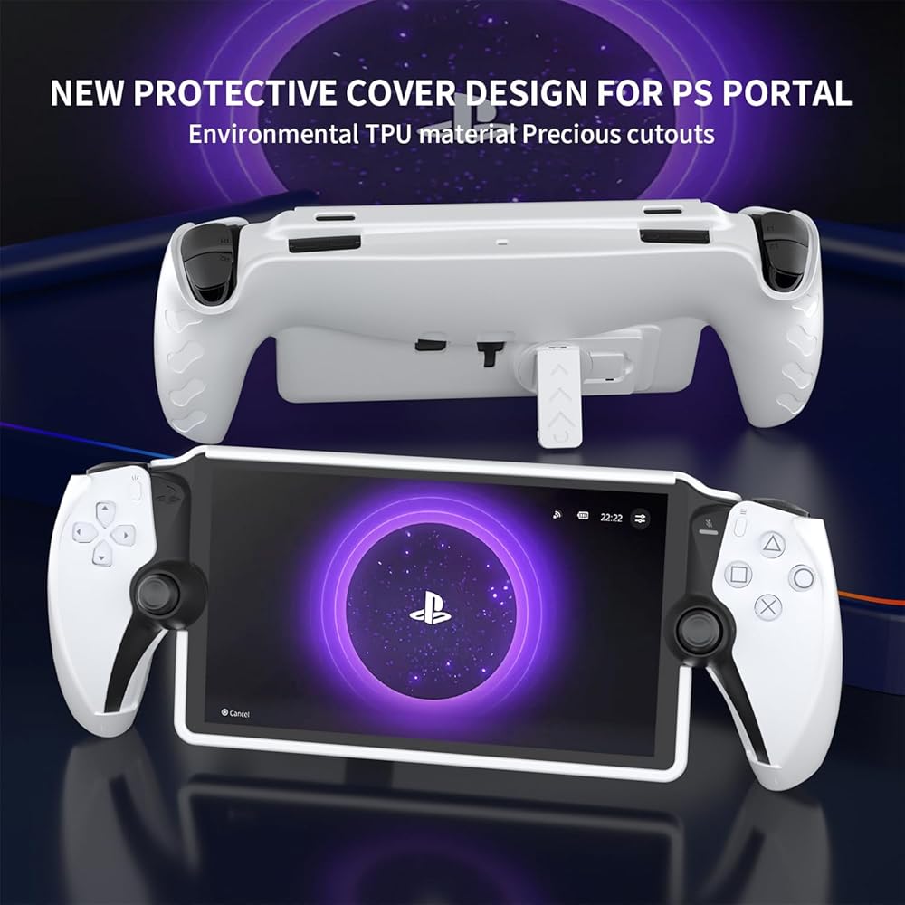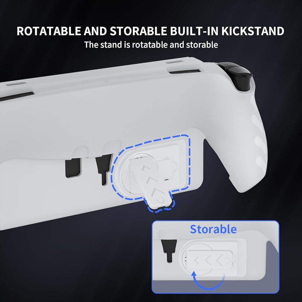 【مسند مدمج قابل للدوران والتخزين】تم تصميم الجراب الخلفي المصنوع من مادة TPU بمسند مدمج، والحامل قابل للدوران ليناسب احتياجاتك وقابل للتخزين لمنع حدوث أي إزعاج. يضمن هذا التصميم الفريد إمكانية شحن بوابة PS أو عرضها أفقيًا.