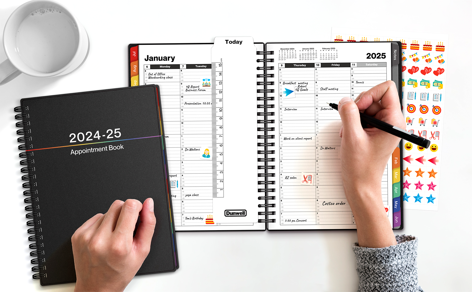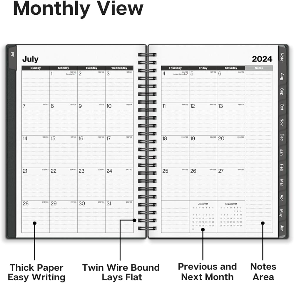 عرض شهري مبوب: نظرة عامة على التقويم المنتشر على صفحتين لكل شهر. مساحة واسعة للكتابة في صناديق يومية مبطنة، تتضمن الشهر السابق والقادم، والعطلات، وعدادات يوم العام، ومكعب الملاحظات.