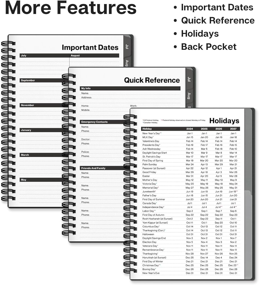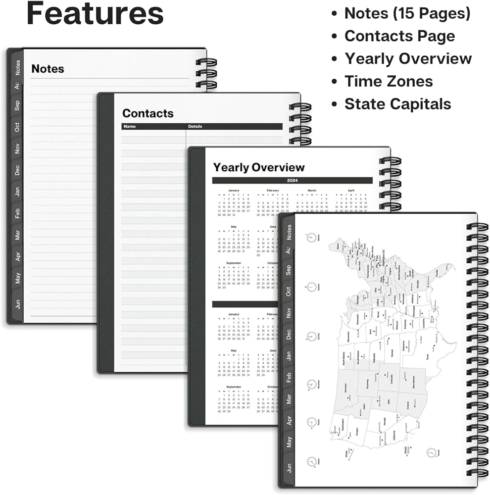 الصفحات الخاصة: نظرة عامة سنوية، مرجع سريع، جهات الاتصال، تواريخ مهمة (أعياد الميلاد، الذكرى السنوية، إلخ.)، العطلات، المناطق الزمنية بالولايات المتحدة الأمريكية وعواصم الولايات، 15 صفحة للملاحظات في الخلف.