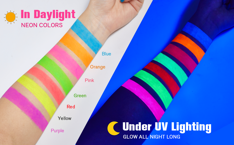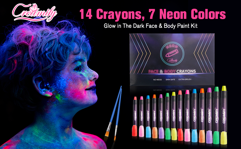🌈Glow in The UV Light Paint: Creamify 14 neon paint crayons featuring 7 vibrant fluorescent colors that shine brightly under UV light or black light, creating eye-catching makeup effects.Note:face paint cannot glow in the dark directly.