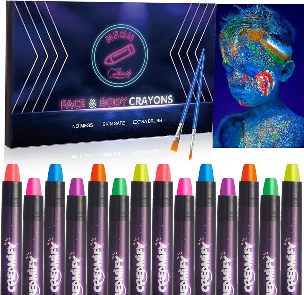 🌈Perfect Gift: This fluorescent face paint crayon kit is a unique and perfect gift , ideal for black light birthdays, halloween, masquerades, cosplay, festivels and makeup parties with UV lighting.
