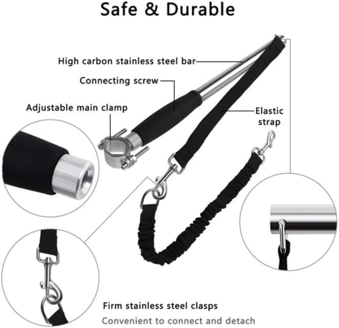 Stainless steel bar: Bar's handle covered with silicone for a better grip when using as a walking leash, and steel clamp contains a nonslip rubber piece, this can help protect your bike from scratching.