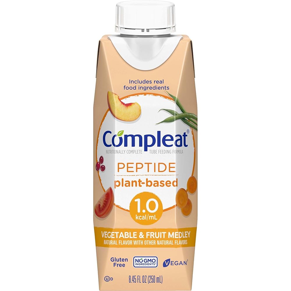 Compleat Peptide 1.0 is a peptide-based tube-feeding formula flavored for drinking, too! Made with real fruit and vegetable ingredients like tomatoes, peaches, and carrots, along with hydrolyzed pea protein, this formula is a great choice for long-term tube-feeding regimens. Each 1000 mL serving contains the equivalent of 1 cup of fruits and vegetables. Compleat Peptide 1.0 is plant-based and vegan (1), contains no GMO ingredients (2), and has none of the common food allergens. It is free of dairy, nuts, corn, and soy. We know you want the best for your family, which is why we offer tube-feeding formulas with fruit and vegetable ingredients and complete nutrition—from a brand that has been widely used by healthcare professionals for over 50 years. Pack of 24 (1) Pursuant to U.S. Nestle Health Science's vegan policy (2) Pursuant to U.S. Nestle Health Science's non-GMO policy