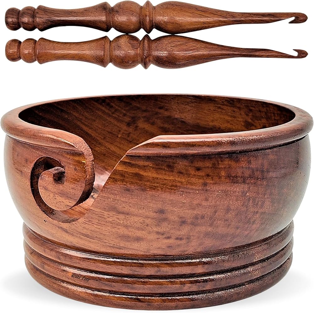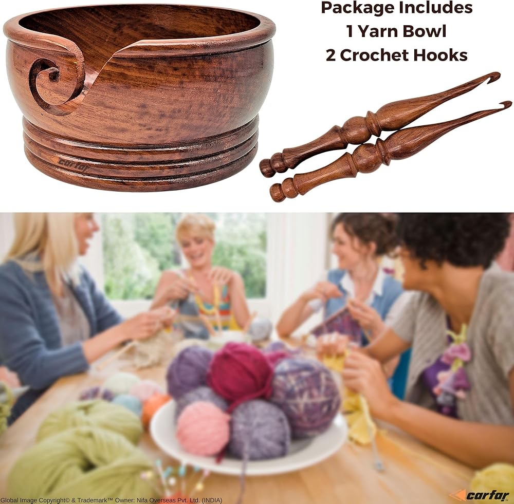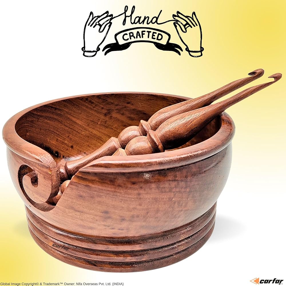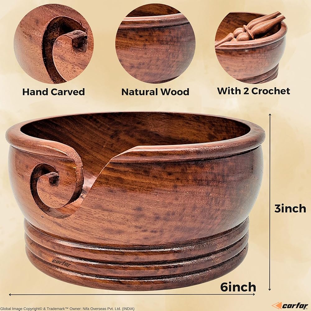 - 🧶 وعاء غزل خشبي من كارفار يبلغ قطره حوالي 15.24 سم × ارتفاع 7.62 سم. يمكن أن يناسب وعاء الغزل الخشبي كرة من الغزل بوزن 3.5 أونصة بشكل مريح.