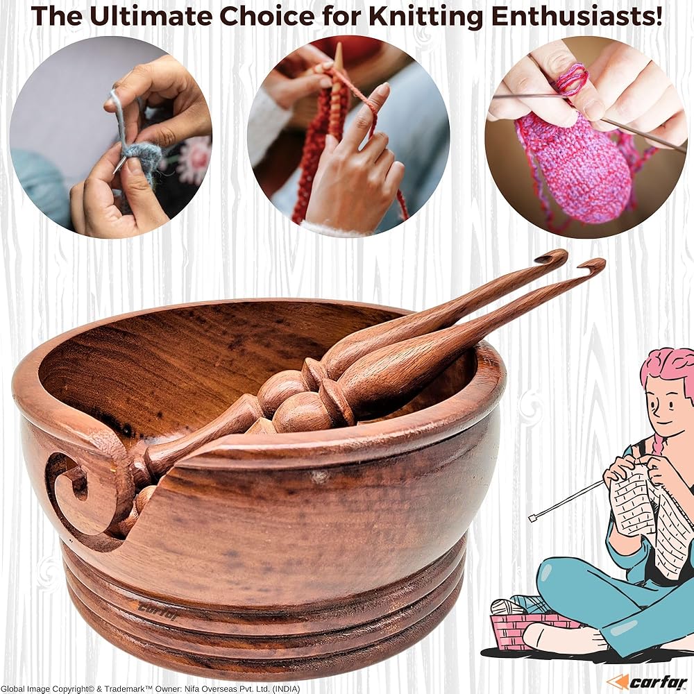 مجموعة وعاء غزل الحياكة من كارفار وخطاطيف كروشيه مصنوعة يدويًا من الخشب ووعاء حامل للحياكة والحياكة
