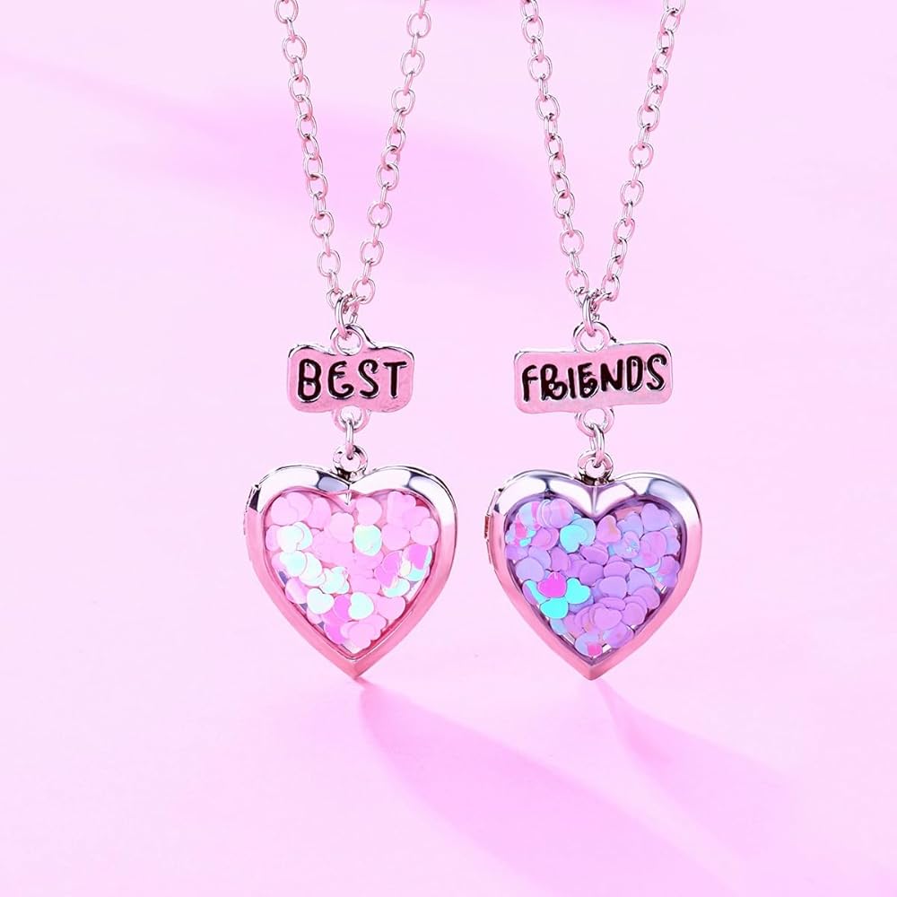 • 💕قلادة مدلاة على شكل قلب: تأتي قلادة مدلاة الصداقة المتطابقة مع تصميم قلبين، والترتر الوردي والأرجواني الذي يزين قلادة القلب مما يجعلها تبدو جميلة وجذابة للغاية. افتح المدلاة لتكتشف أن الصورة جميلة جدًا، تمامًا كما لو كان صديقك المفضل معك دائمًا.