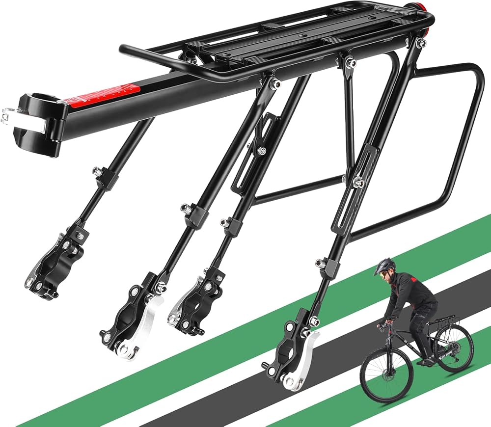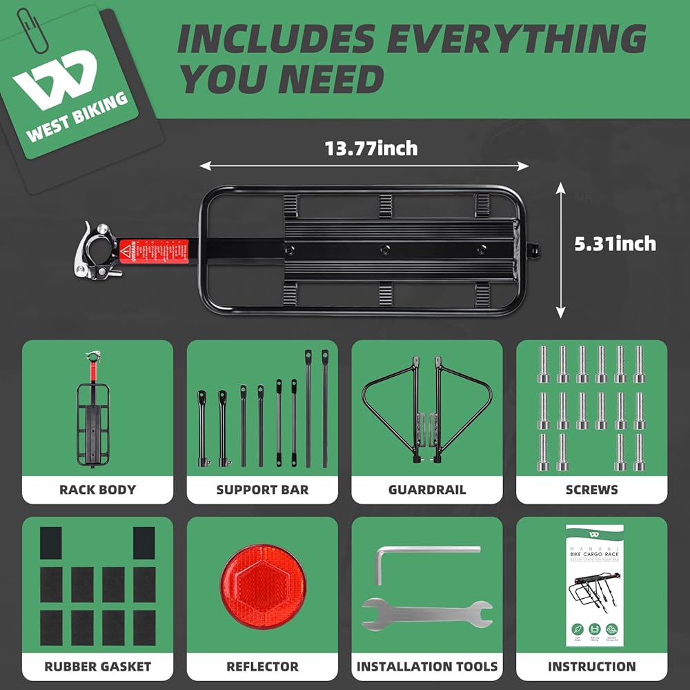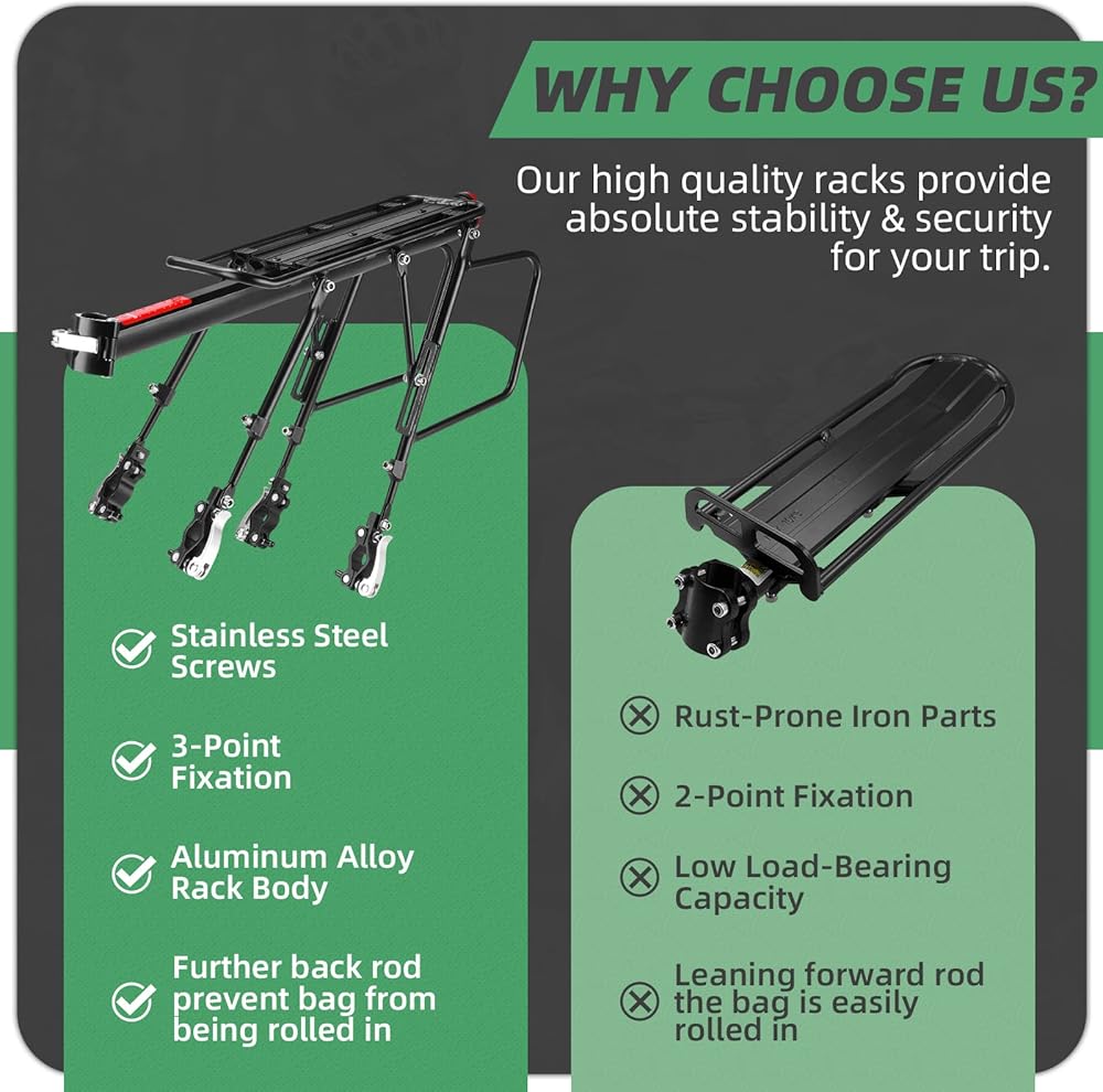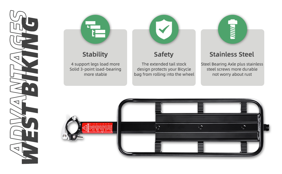 تحميل متين بوزن 220 رطلًا: يعتمد رف البضائع للدراجة هذا على تصميم هيكل علمي للحمل، و4 قضبان دعم سميكة وهيكل ثابت مثلثي يجعل رف الدراجة لظهر الدراجة قويًا جدًا ويمكنه دعم حمل يصل إلى 220 رطل، بشرط أن تكون البراغي تشديد. يمكن لرف حمل الدراجة أن يلبي جميع احتياجاتك اليومية للحمل، ويمكنك استخدامه بثقة.