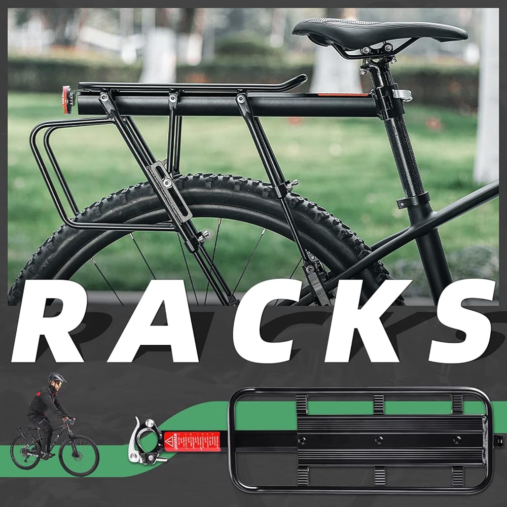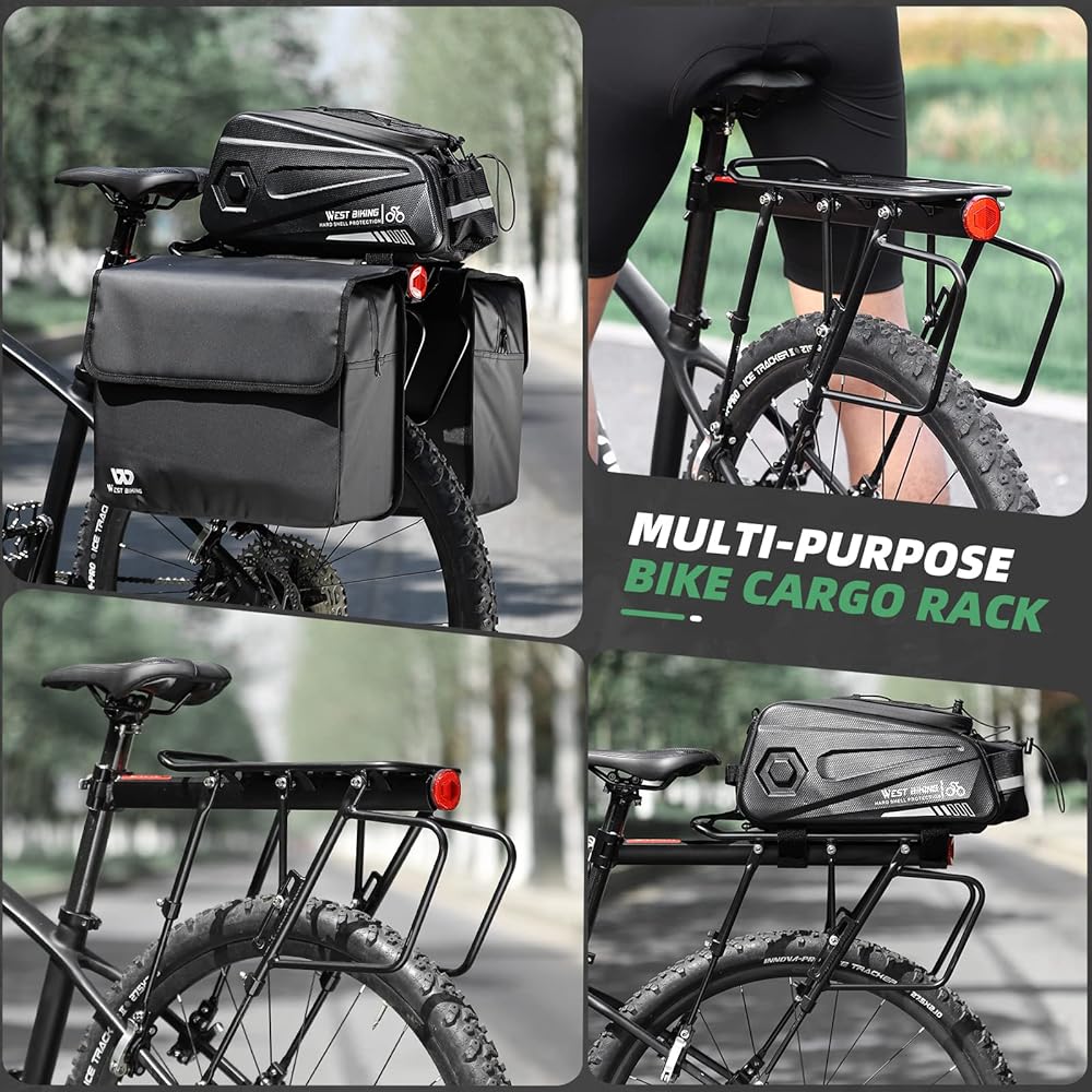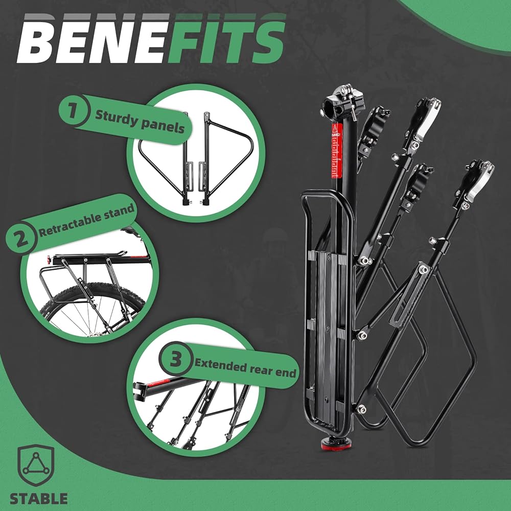 تحميل متين بوزن 220 رطلًا: يعتمد رف البضائع للدراجة هذا على تصميم هيكل علمي للحمل، و4 قضبان دعم سميكة وهيكل ثابت مثلثي يجعل رف الدراجة لظهر الدراجة قويًا جدًا ويمكنه دعم حمل يصل إلى 220 رطل، بشرط أن تكون البراغي تشديد. يمكن لرف حمل الدراجة أن يلبي جميع احتياجاتك اليومية للحمل، ويمكنك استخدامه بثقة.