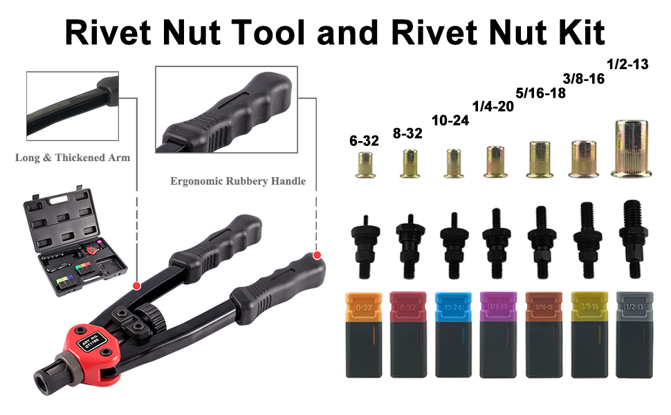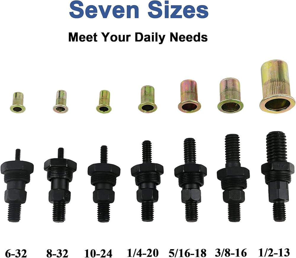 • 【سهلة الاستخدام】 مسدس التثبيت SAE مقاس 13 بوصة يسهل تغيير المغزل وقطع الأنف يدويًا، مع 7 قطع ممسك قابل للتبديل (6#-32 8#-32 10#-24 1/4 بوصة-20 5/16 بوصة) -18 3/8"-16 1/2"-13).